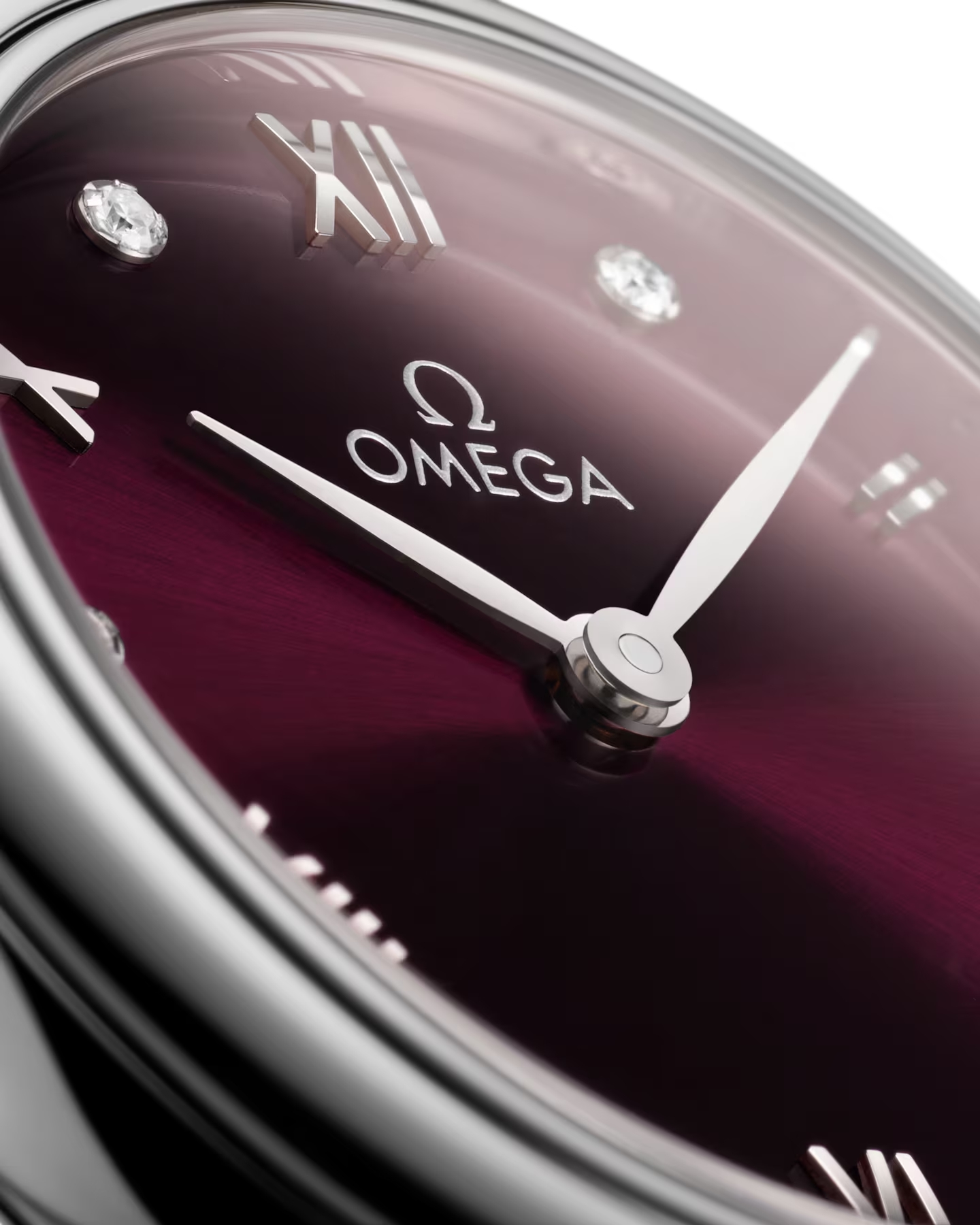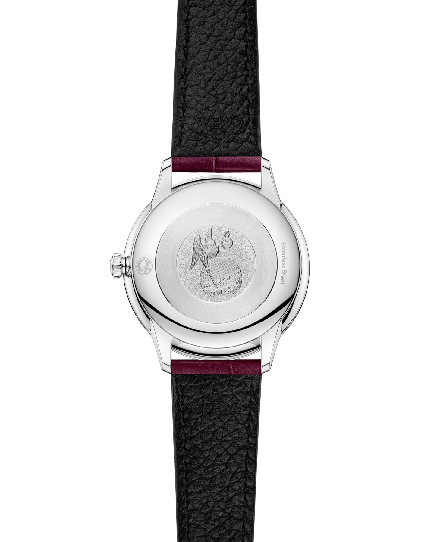 この時計には、きらめくバーガンディのレザーストラップが付属しており、最低でも48か月の電池寿命を備えたオメガ クォーツキャリバー4061によって駆動しています。