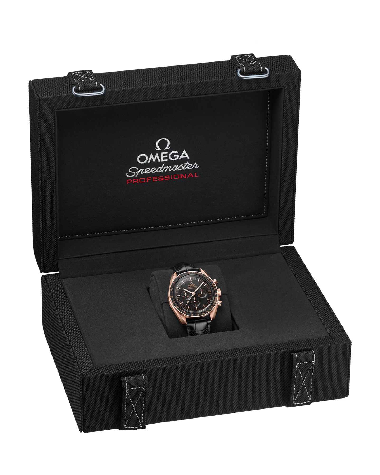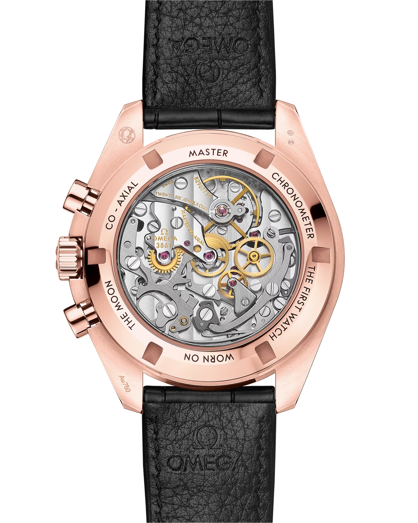 ブラックのレザーストラップが付属する、この42 mmの18Kセドナ™ゴールド製ムーンウォッチは、フロントとケースバックにサファイアクリスタルガラスが採用されています。月面で着用された第4世代のスピードマスターのデザインからインスピレーションを得たこのモデルも、非対称ケース、段差を設けたブラックダイアル、陽極酸化処理を施したアルミニウム製ベゼルリングに配された有名な「ドットオーバー90」(90の数字の上にドット)を採用しています。