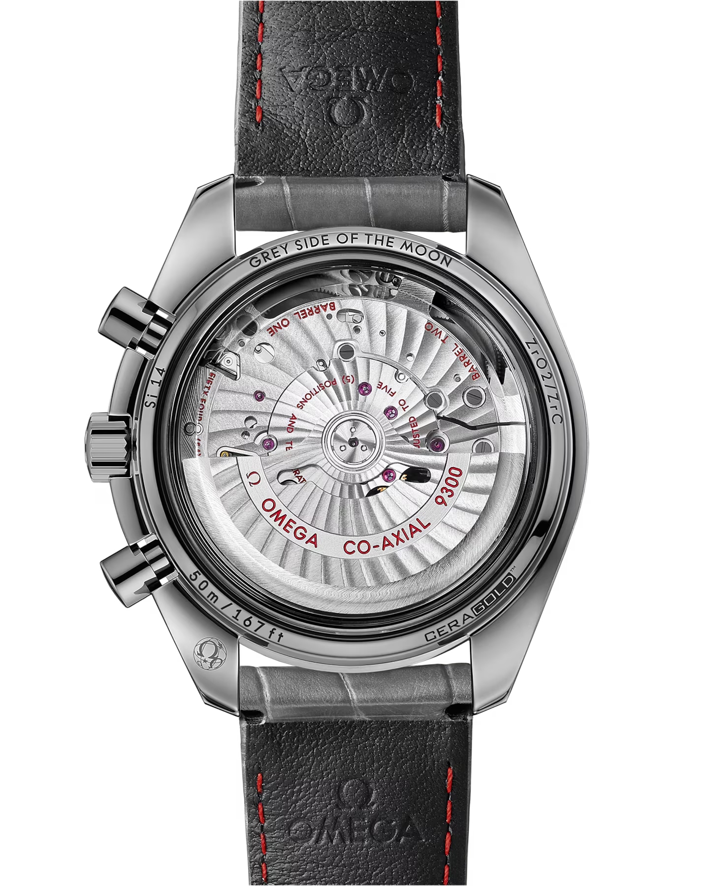 「スピードマスター グレーサイド オブ ザ ムーン メテオライト」は、これまでの伝説のモデルと同様に、3時位置に60分と12時間の積算計、9時位置にスモールセコンド サブダイアルが配置されています。また、サファイアクリスタルガラスのケースバックからは、オメガ コーアクシャル キャリバー9300を眺めることができます。