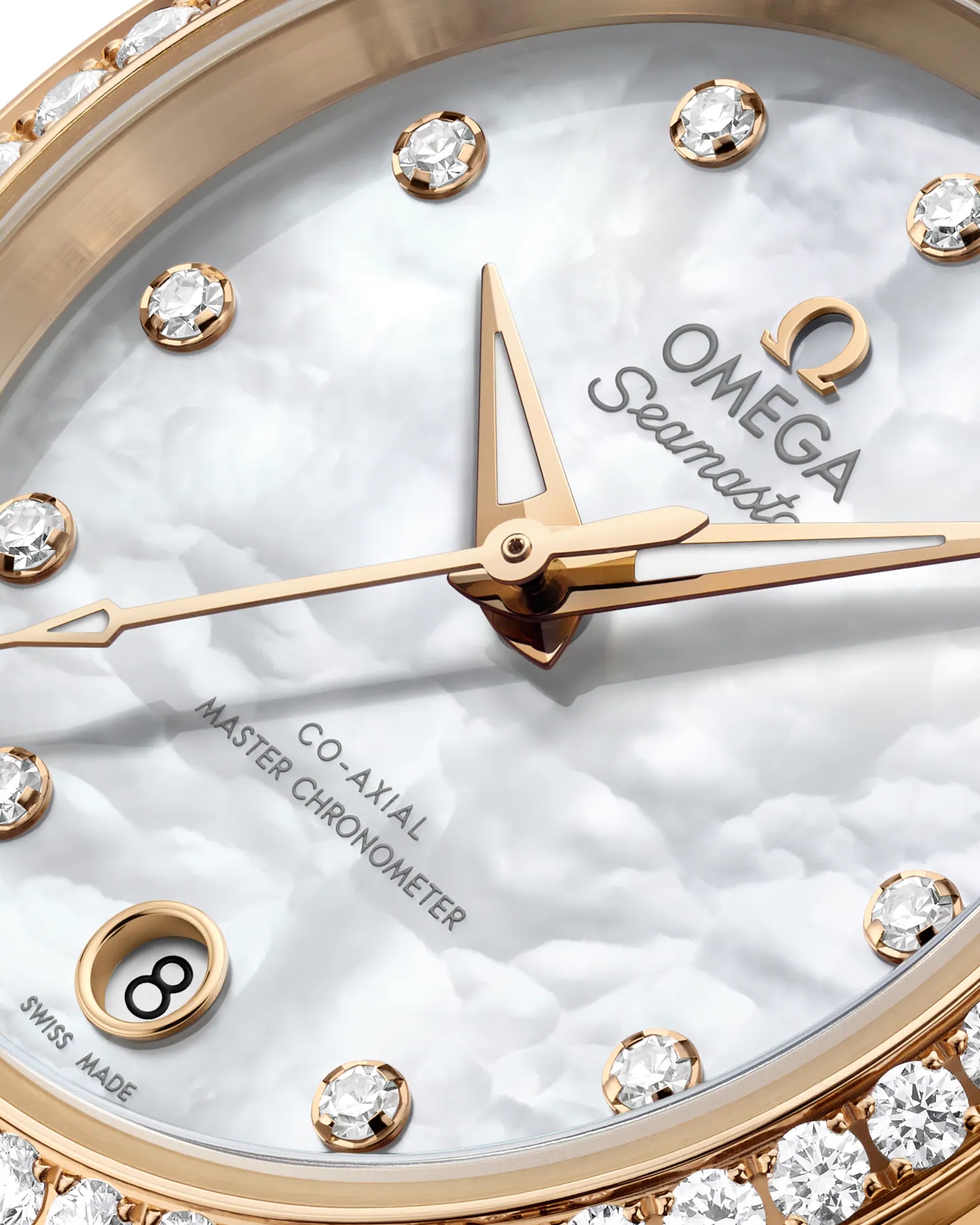全体に光沢のある仕上げが施されたホワイト マザーオブパールのダイアルは、6時位置に丸型の日付窓が備えられています。11個のインデックスと面取りを施し新たにデザインされた針が配され、分針は先に行くにつれ細くなる繊細な形状に仕上げられています。アプライドのディテールはすべて18Kムーンシャイン™ ゴールド製で、18Kイエローゴールド製の針にはムーンシャイン™ ゴールドがPVDコーティングで施されています。針にはまた、ブルーの光を放つスーパールミノヴァが塗布されています。