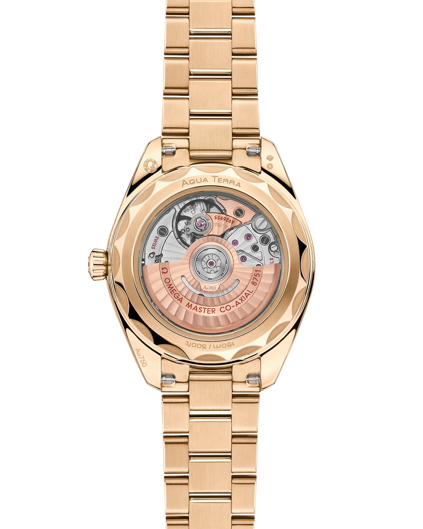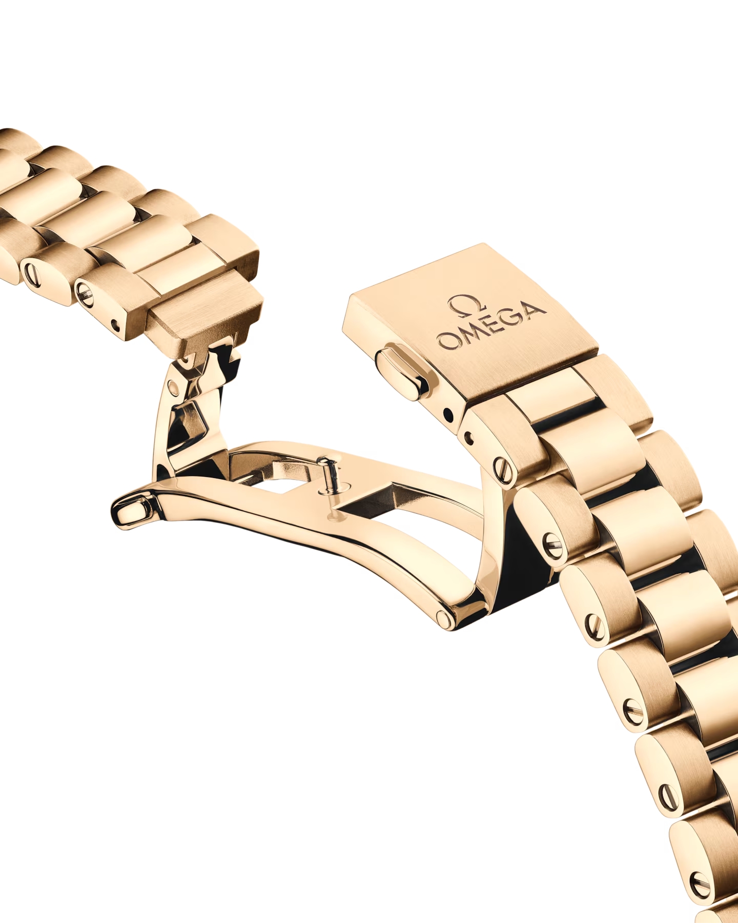 フォールディング バタフライクラスプとオメガのコンフォートリリースシステムが付いた、ポリッシュ&ブラッシュ仕上げが施されたラウンド型のコマから成る18Kムーンシャイン™ゴールド製一体型ブレスレットが合わせられています。