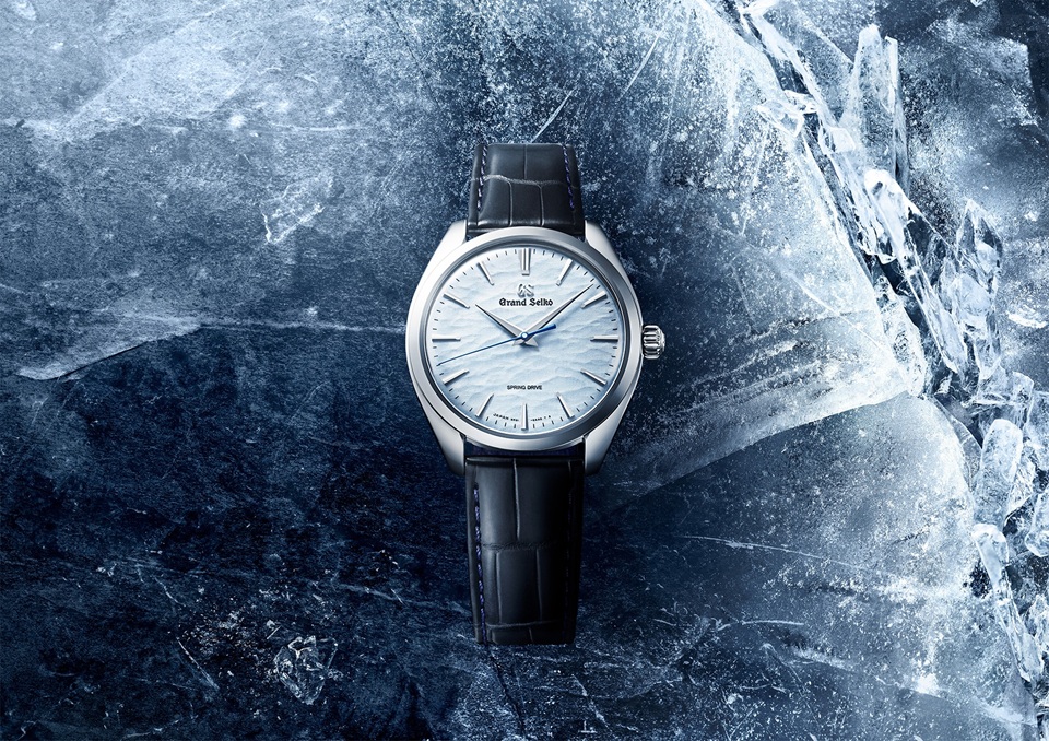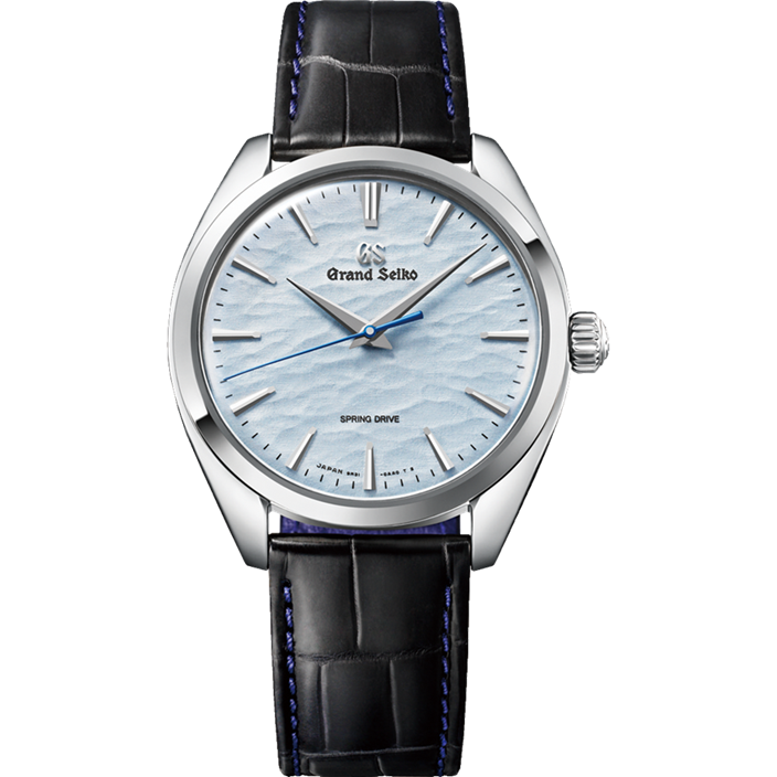 スプリングドライブモデルが生まれるセイコーエプソン塩尻事業所内「信州 時の匠工房」にほど近い諏訪湖で、真冬に全面結氷した時に起きる神秘的な自然現象「御神渡り(おみわたり)」をイメージしたダイヤルです。湖上で隆起した氷の山脈を表現したアイスブルーのダイヤルの上を、ブルースチールの秒針が流れるように進みます。