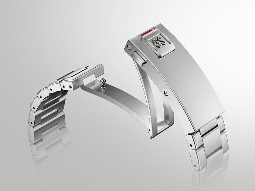 ブレスレットには、微調整機構つきスライドロックエクステンダー方式を採用しました。 2mm×3段階の6mmのアジャストができることに加えて、ダイビングでの使用を想定して、エクステンダー部分でさらに18mm拡張することができ、合計で24mmのサイズ調整が可能となりました。さらに、GSロゴの入ったワッペン部分に中留開閉のロック機能を持たせ、意図せず中留のロックが解除されてしまうことを防ぎます。