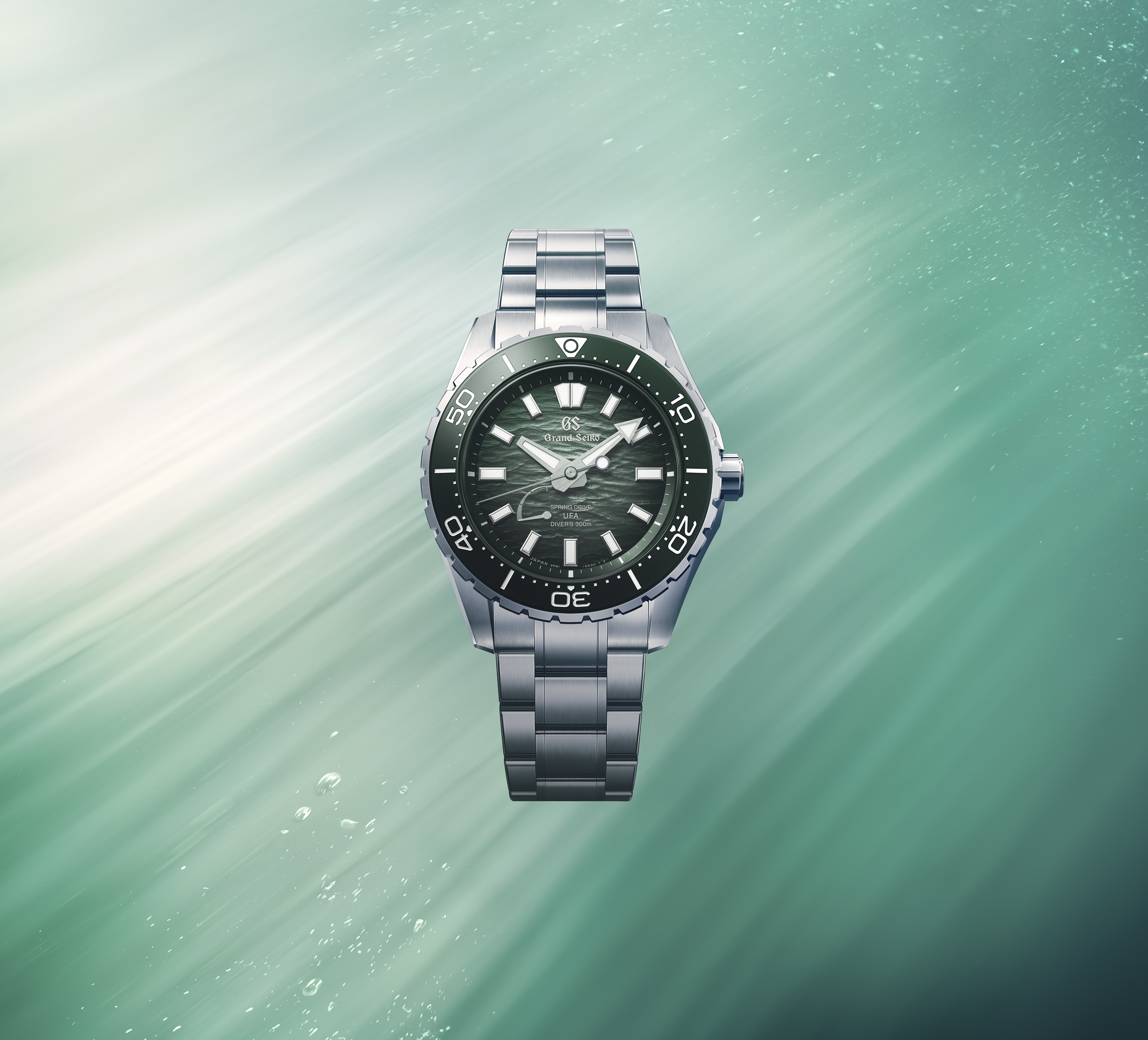 ダイヤルは、島国である日本を取り巻く潮流の躍動感に着想を得て、潮の流れを型打ちパターンとカラーグラデーションで表現。外側を暗くすることで時刻の視認性を高め、中心を明るくすることでパターンを際立たせました。そのカラーグラデーションは、潮の流れる様を強調し、海の広がりを感じられるような効果ももたらしています。グリーンのダイヤルは澄んだ海の浅瀬の透明感を映し出しています。