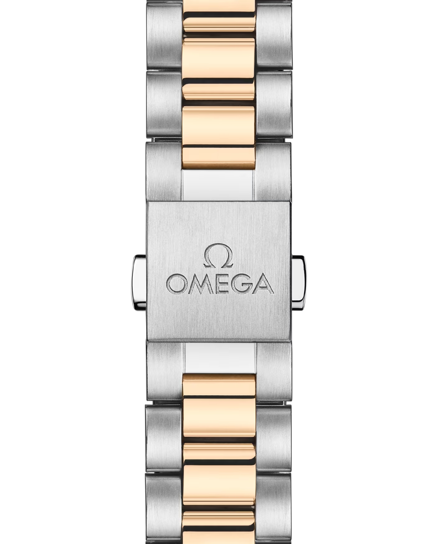フォールディング バタフライクラスプとオメガのコンフォートリリースシステムが付いた、ポリッシュ&ブラッシュ仕上げが施されたラウンド型のコマから成るステンレススティール&18Kムーンシャイン™ゴールド製一体型ブレスレットが合わせられています。