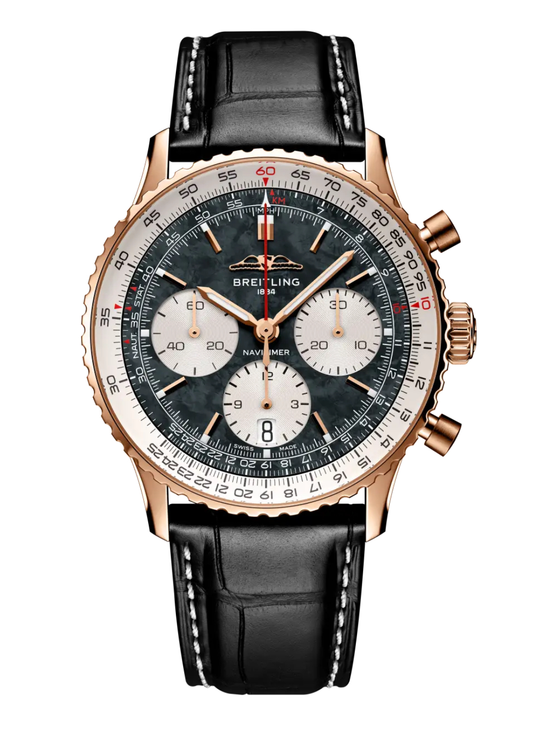 今日のナビタイマーはその最もクラシックな特徴を保ちながらも、現代に即した改良を加えています。平らにした回転計算尺とドーム型サファイアクリスタルで、よりスリムな外観を実現。金属部分にはポリッシュとサテン仕上げを交互に施すことで、光沢を出しつつも控えめな印象に。そして、AOPAの翼が本来の12時位置に戻ったこともその長い歴史の出発点を思い起こさせるアップデートと言えるでしょう。 この日本限定モデルは、文字盤部分にブラック・マザー・オブ・パールを採用した特別仕様。光を受ける加減によって表情を変える繊細さは、唯一無二のものです。18Kレッドゴールドケースを採用し、搭載するムーブメントCal.01のローターも、ケース同様の18Kゴールド製。その動きが見られるケースバックには「ONE OF 50」の刻印が施されています。あなたの達成を記念する、誇り高き徽章のようなクロノグラフです。