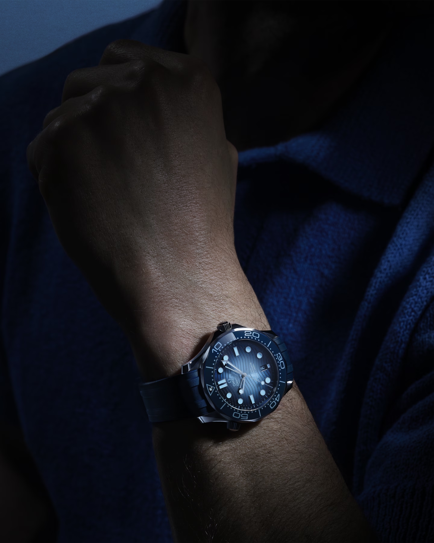 42mmの「シーマスター ダイバー300M」には、ステンレススティール製ケースにブルーのラバーストラップが合わせられています。セラミックのダイアルカラーは、オメガ独自のSummer Blue。PVD加工とグラデーションが施されたダイアルが、時計のもつ防水性のレベルを反映しています。「ダイバー300M」のアイコニックな波模様も描かれています。