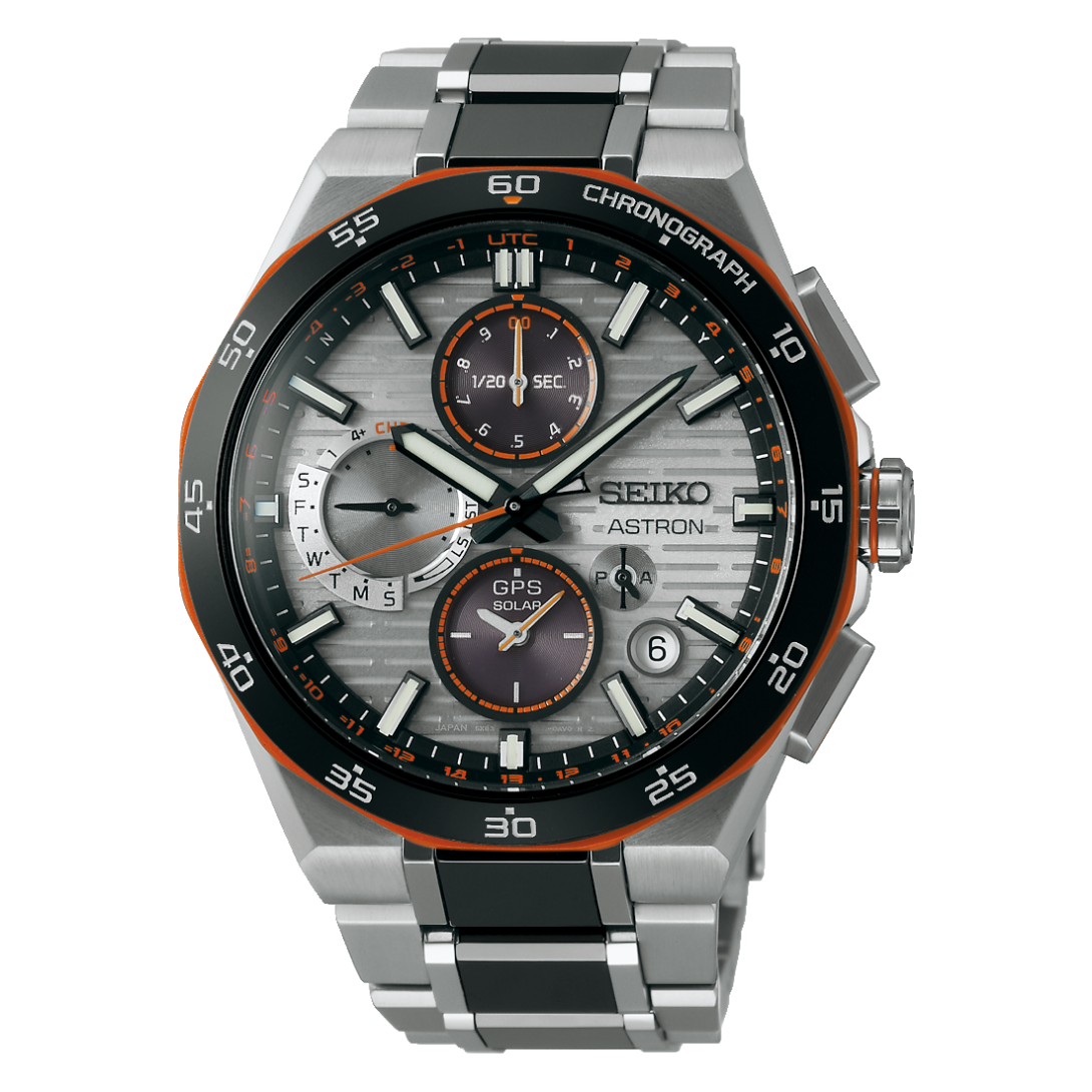 また、ベゼルとブレスレットの中駒にブラックセラミックスを組み合わせ、随所にネオンオレンジカラーのアクセントを加えた、スポーティなデザインが特徴です。