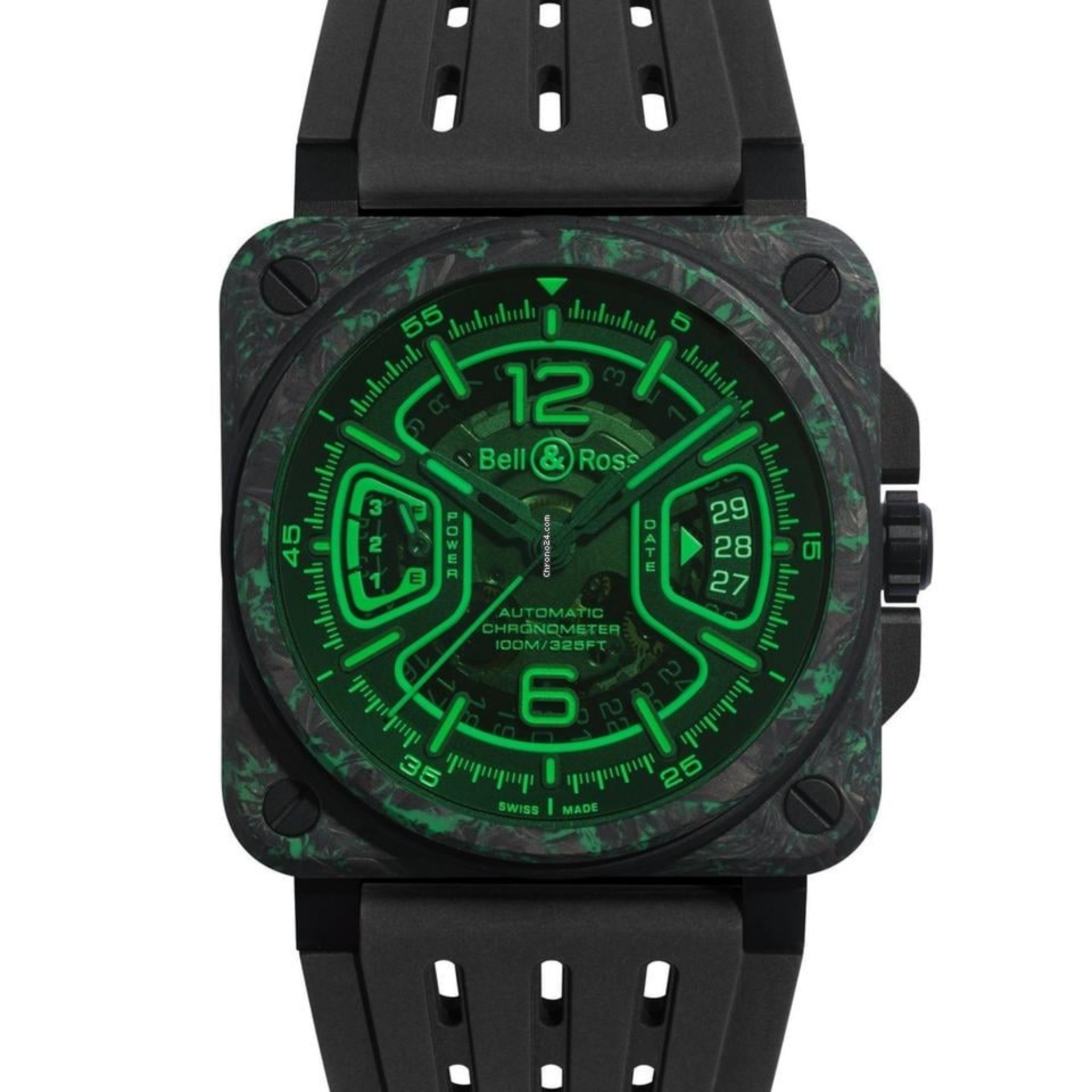 文字盤 : 3層構造。サファイアクリスタルのベースプレート、マイクロブラスト加工の発光アプライドフレーム、マイクロブラスト加工のインサート。Super-LumiNova® X1 (緑色発光)を充填したアプライドインデックス。Super-LumiNova® X1 (緑色発光)を塗布した時針と分針。 カバーガラス: 反射防止サファイアクリスタル。