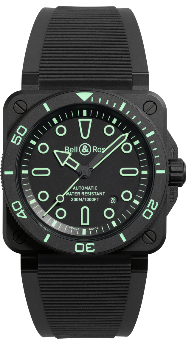 発光は技術的機能を超え、スタイルそのものとして成立しています。Bell & Rossは、Full Lumで打ち出したコンセプトをBR-03 Diver Lum Outlineでさらに洗練させました。Super-LumiNova®により、本質的なラインだけが浮かび上がります。その結果「Less is More (最小限が、最大の美を生む)」の精神に則った、究極の視認性と徹底した美学が生まれました。