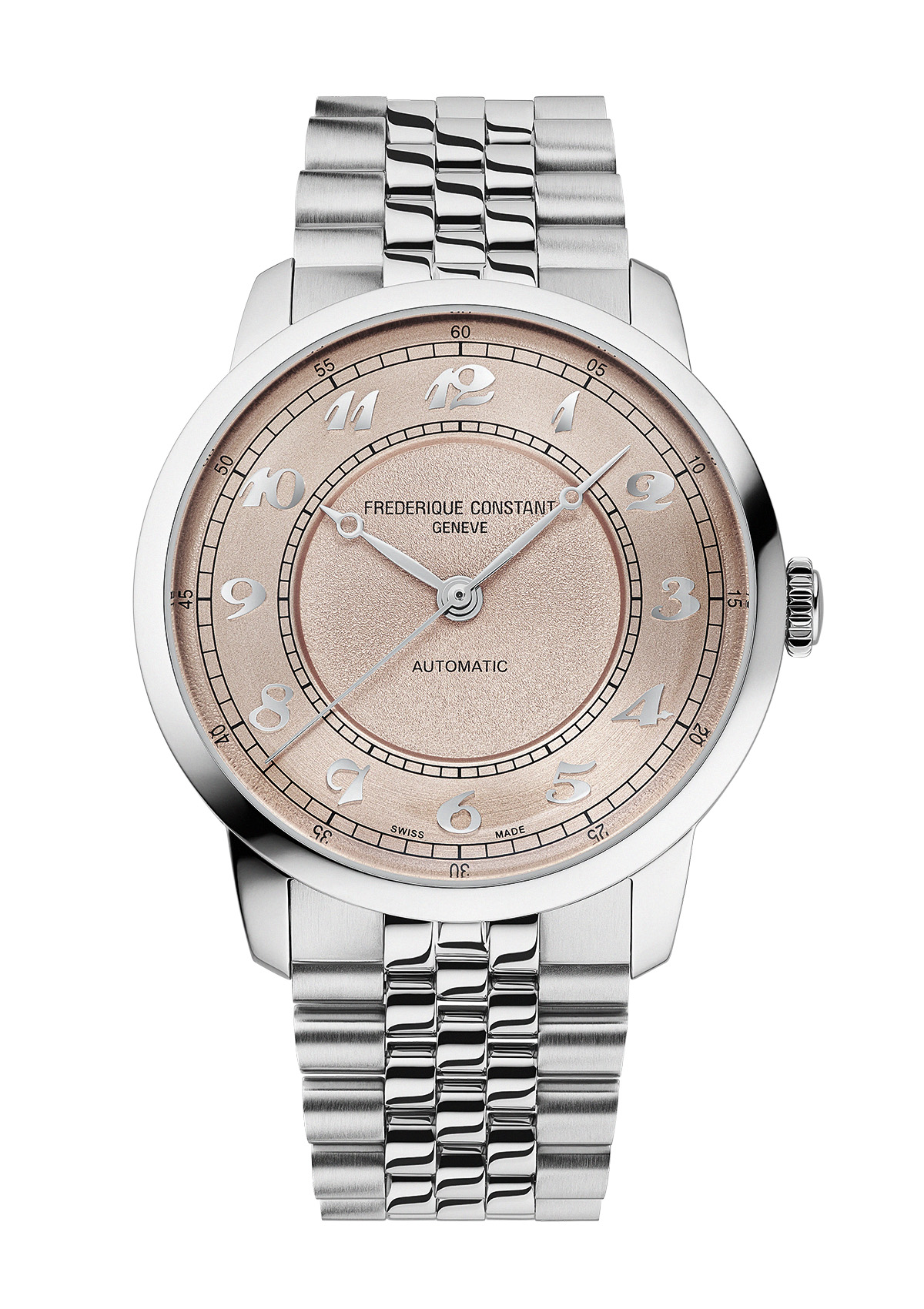 38.5 mm径サイズの自動巻きモデル「クラシック プレミア」。小ぶりなユニセックス仕様のサーモンピンクカラーのダイヤルに、半円形の5連ブレスレットを組み合わせました。中央から縁に向かい膨らむボンベダイヤルの中央は一段下げてグレイン、外周にはソレイユと凝った仕上げを施しました。クリスタルケースバックからは搭載したラ・ジュー・ペレ社のロングパワーリザーブムーブメントが覗きます。