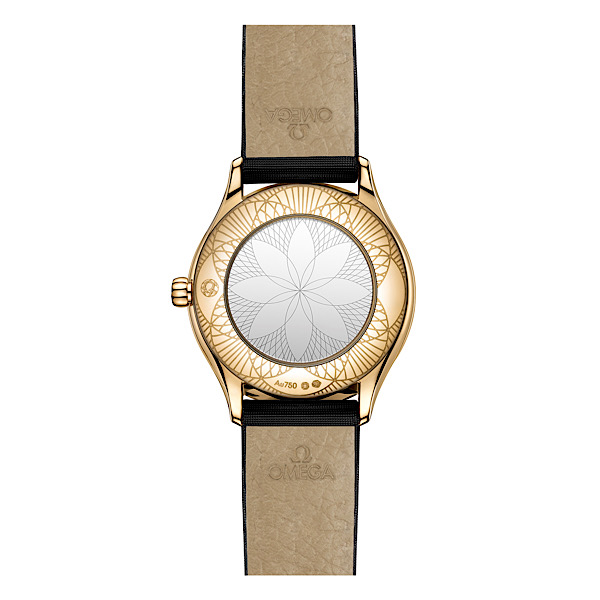 「トレゾア」バックル付きの、ブラックのサテンストラップが付属しています。オメガ キャリバー4061搭載。特殊な鏡面仕上げのケースバックには、「Her Time」エキシビションのシンボルとして使われているフラワーパターンがあしらわれています。