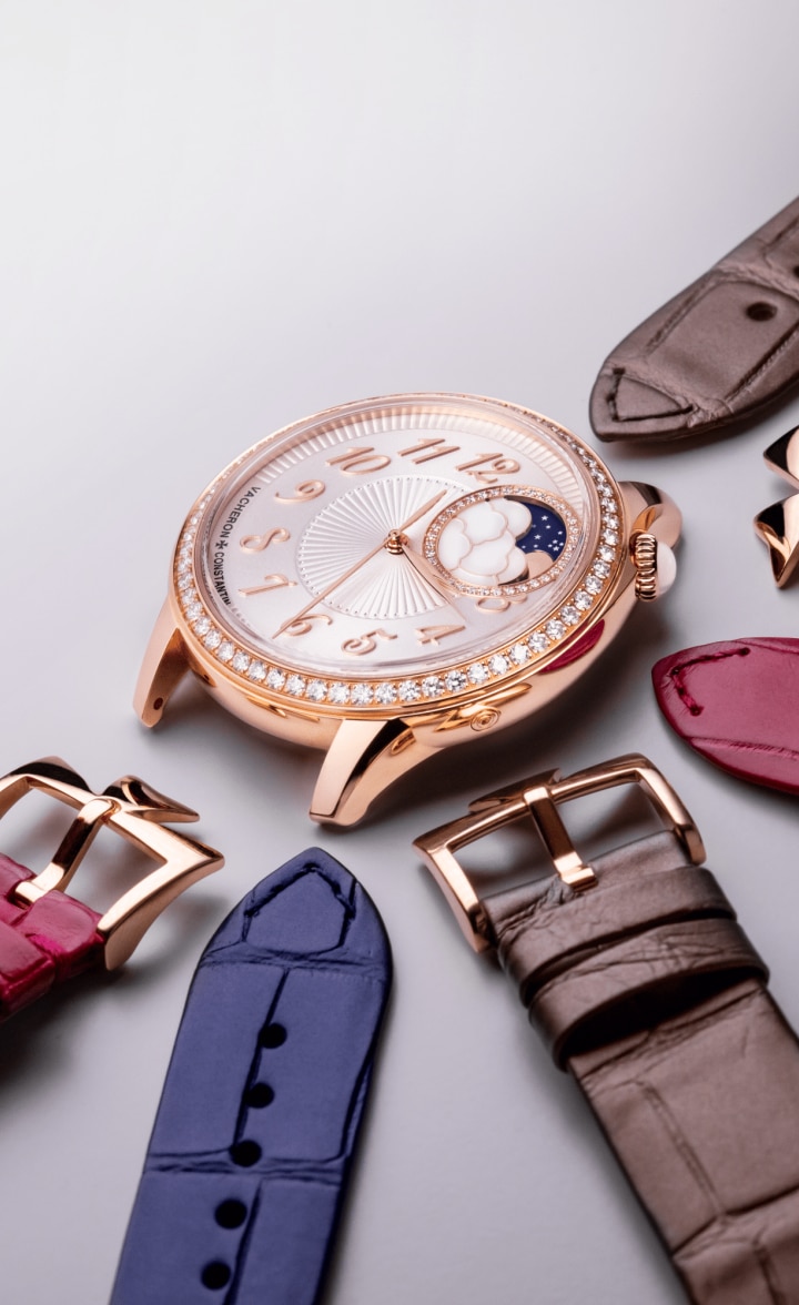 ストラップ:自分で付け替え可能な3本のミシシッピ・アリゲーターレザー(ダークブルー、ダークブラウン、ピンク)、各ストラップに18K(5N)ピンクゴールド製クラスプ