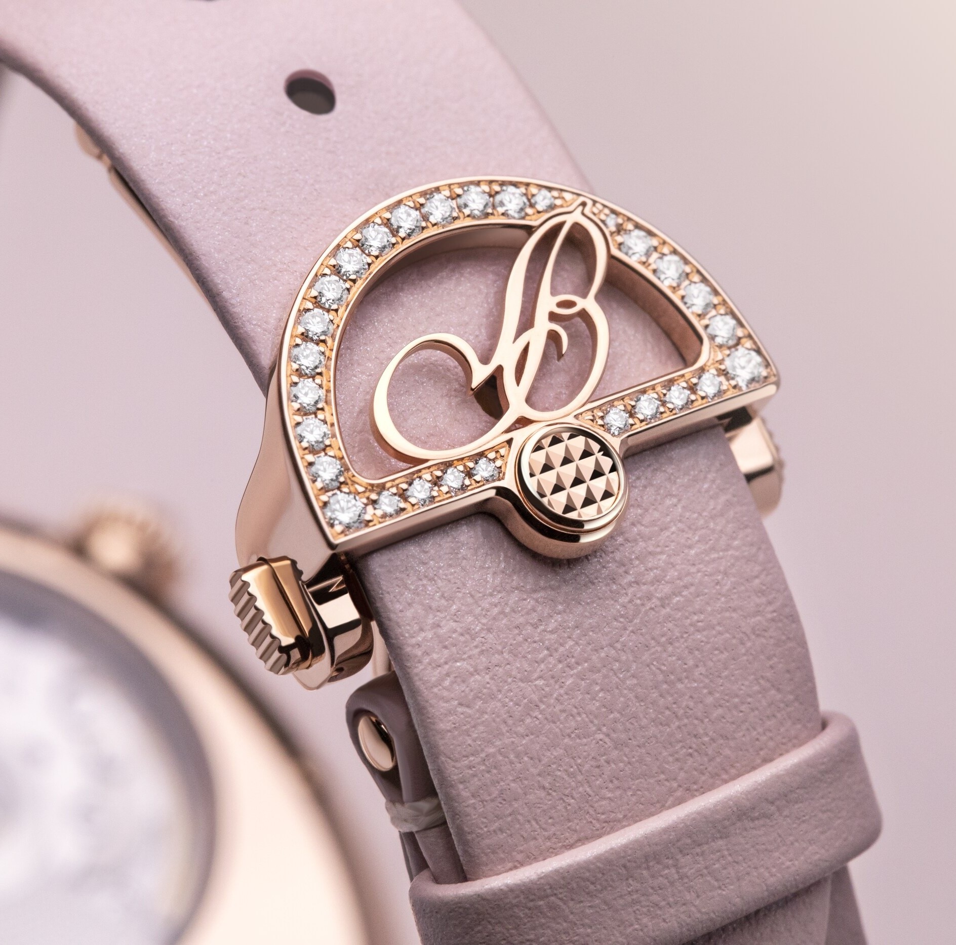 6時位置に輝くペアシェイプ・ダイヤモンドと柔らかな発色の文字盤が女性らしく手元を彩ります。