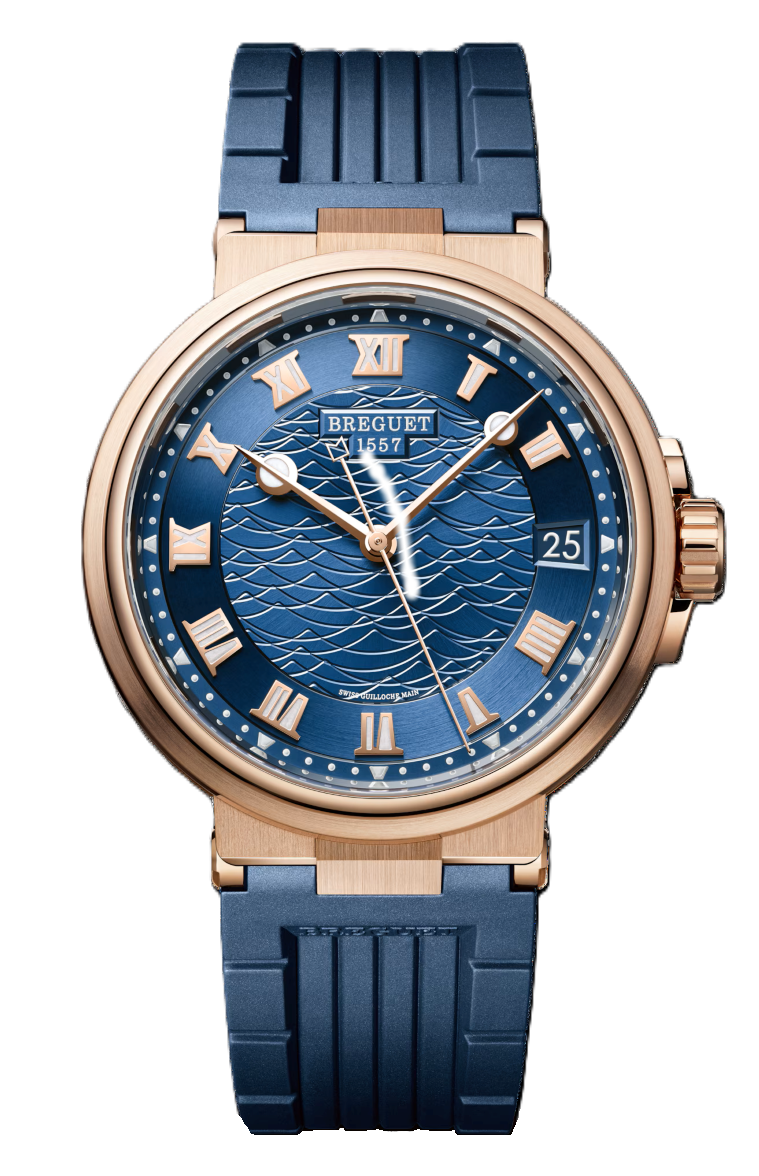 秒針のカウンターウェイトには、ブレゲのイニシャルが刻まれた海事信号旗があしらわれており、そのディテールの数々がマリンスピリットを想起させます。