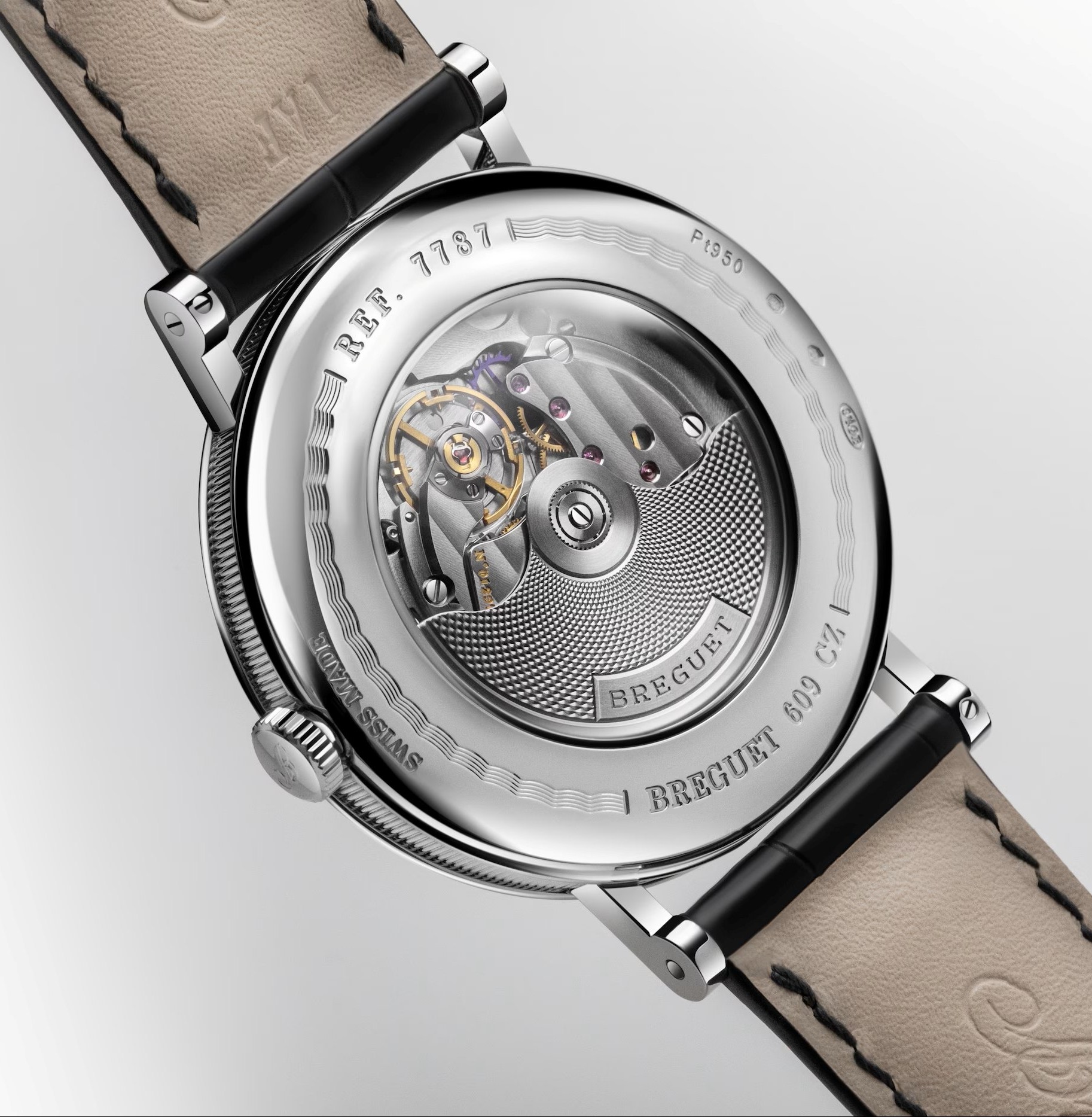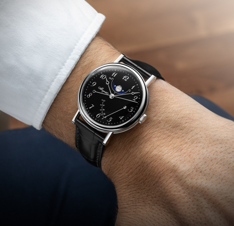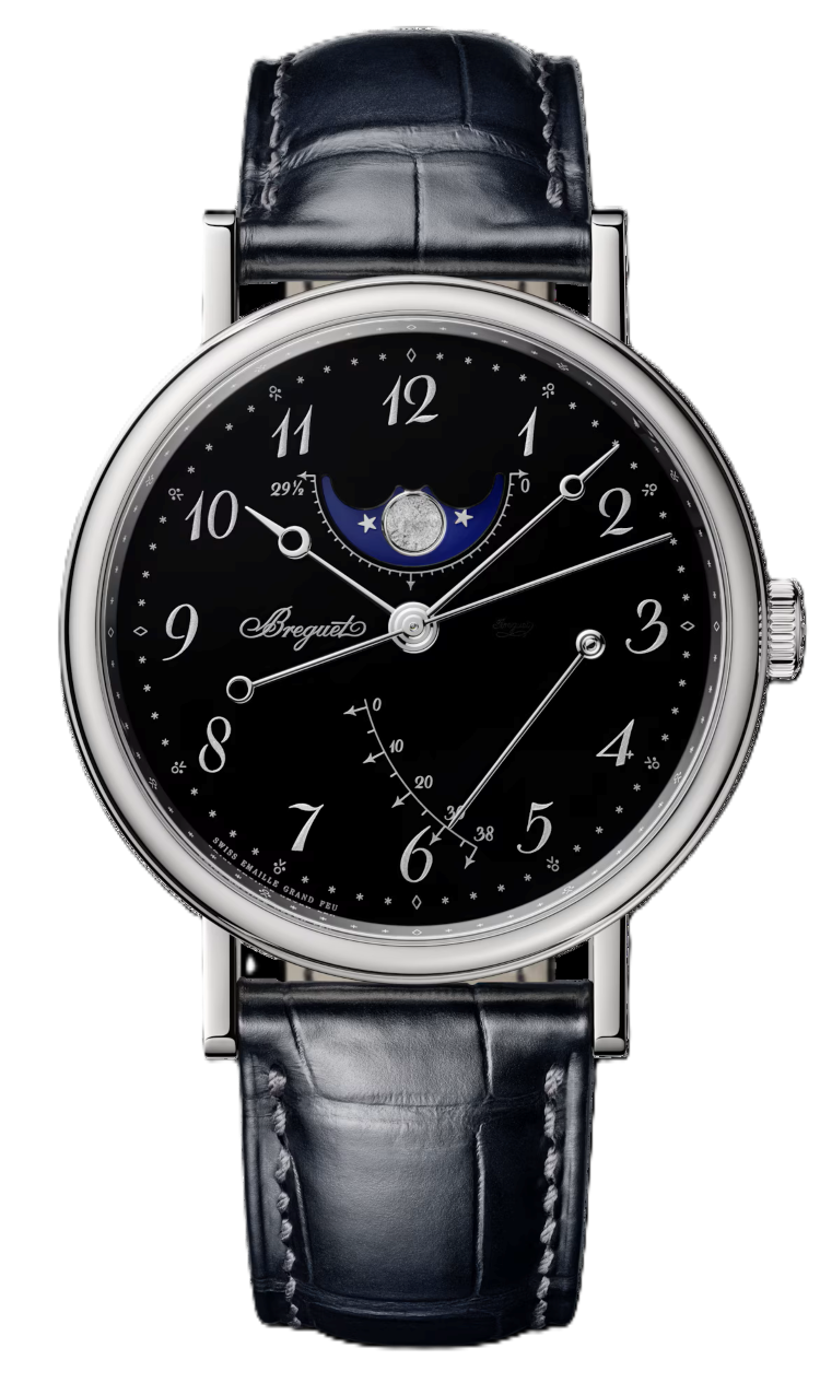 漆黒の夜のように暗い顔立ち、「グラン・フュー」エナメルの輝きの下で輝き、このコレクションで初めて、卓越の象徴である貴金属プラチナのシースに収められている。ブレゲー・クラシックは、7787には月の満ち欠けとパワーリザーブの表示が加えられている。
