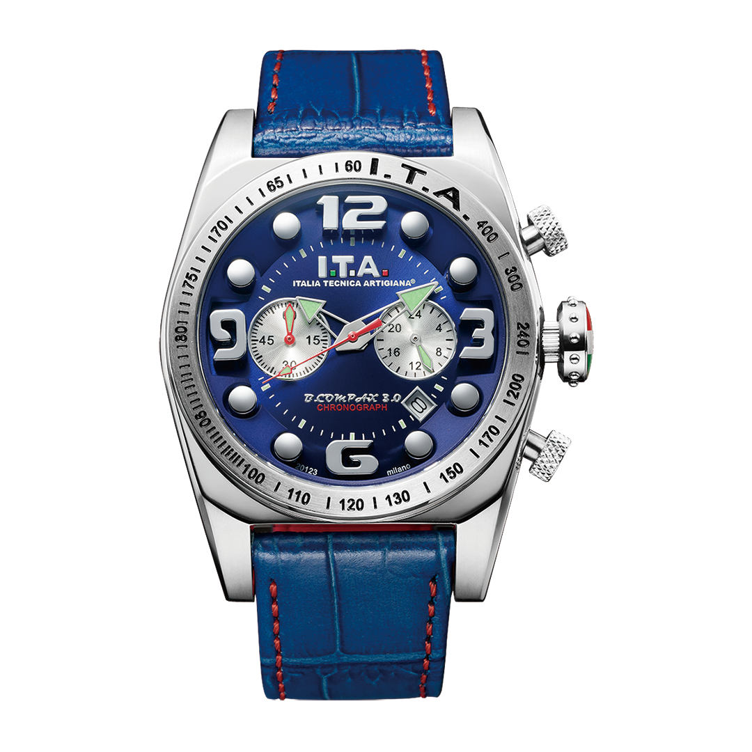 インダイヤルの2つ目の意味を持つ、「ビー・コンパックス」は、クロノグラフながら、スッキリしたデザインが特徴。高級感あふれるカーフのクロコダイル型押しストラップは、ケースやダイヤルのカラーに組み合わせ、イタリアらしさを醸し出しています。ケースサイズをダウンサイズ化し、男性女性問わず、また、オンオフ問わず、お使いになれます。