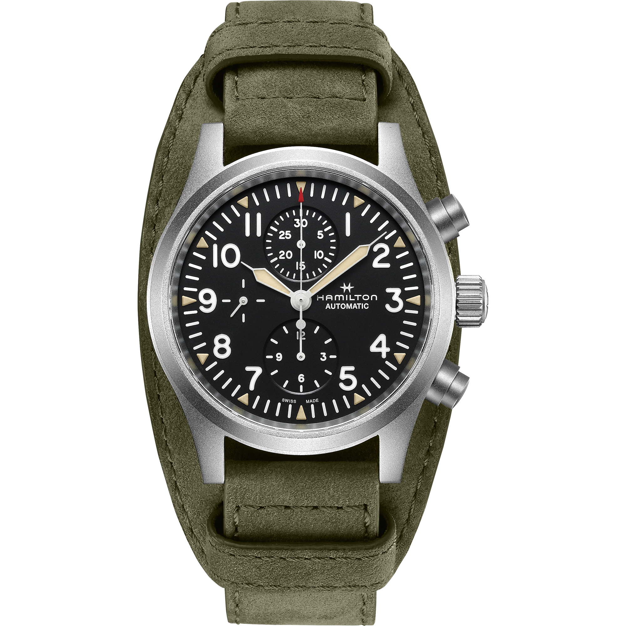 44mmのビッグサイズケースは、サンドブラスト加工が施されたステンレススチールを採用。ケースバックには特別なエングレービングが施され、ハミルトンのミリタリーヘリテージを讃えます。スーパールミノバ加工された立体的なインデックスが高い視認性を実現し、ダイヤルに立体感を与えます。