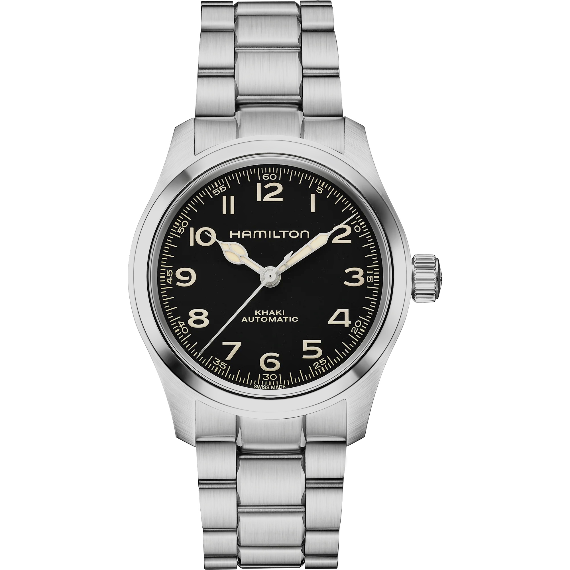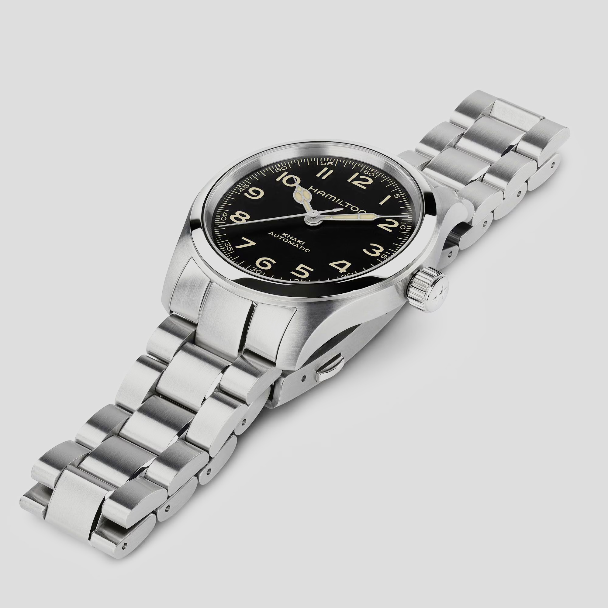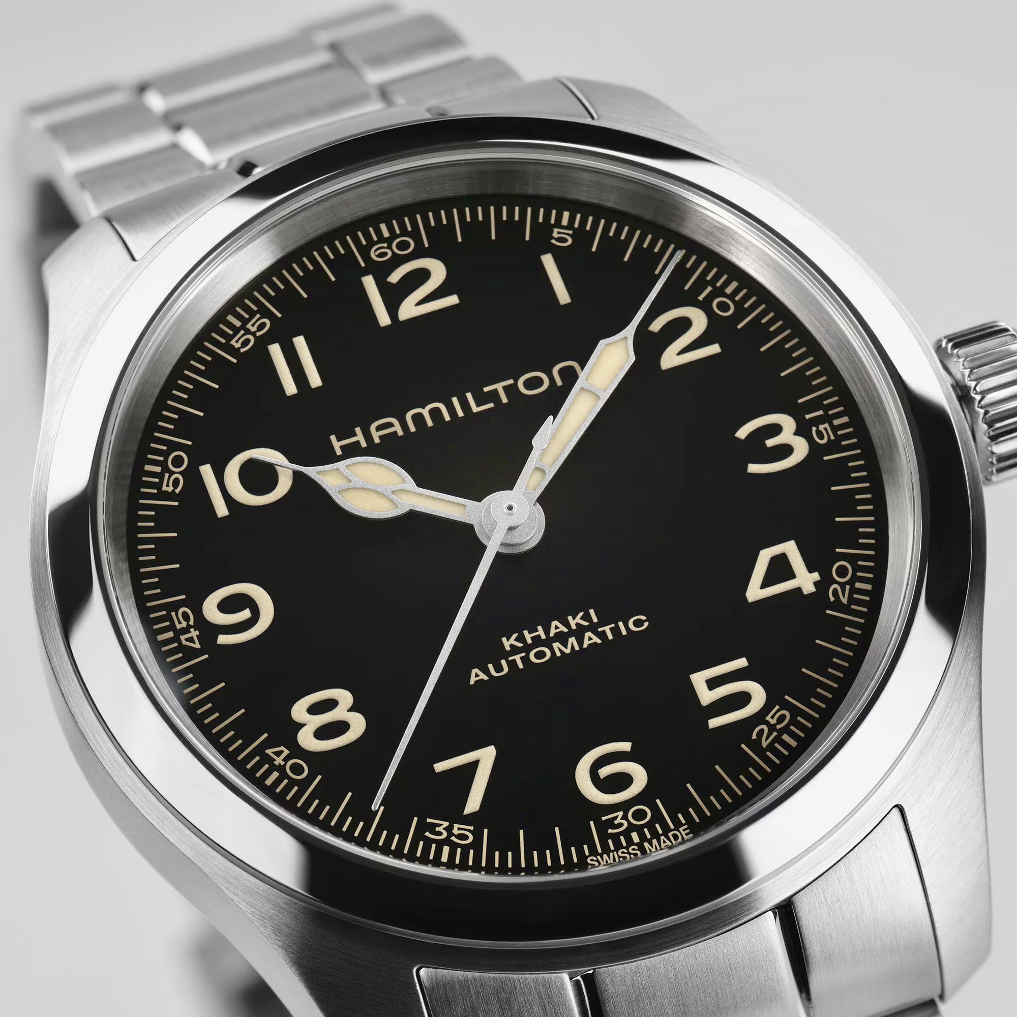 ブラックダイヤルに配された「カーキ フィールド マーフ」の数字はやや膨らみを持ち、視認性が向上。カテドラル針がビンテージルックを添えます。