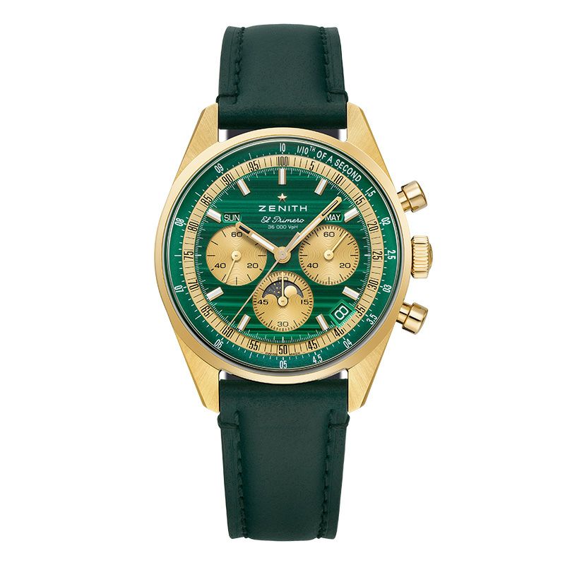[日本限定] 日本のためだけにデザインされた特別なタイムピース。天然のマラカイトを贅沢に使用した文字盤は、55本すべてがユニークな表情を持ちます。イエローゴールドのケースと神秘的で硬質な光を放つマラカイトのコンビネーションは力強い魅力を持ちます。マラカイトは希少な素材として知られ、ゼニスが文字盤に使用するのは今回が初めて。コードバンレザーをストラップに採用することで、使用するオーナーだけに出せる変化していくレザーの質感をお楽しみいただけます。日本限定55本。