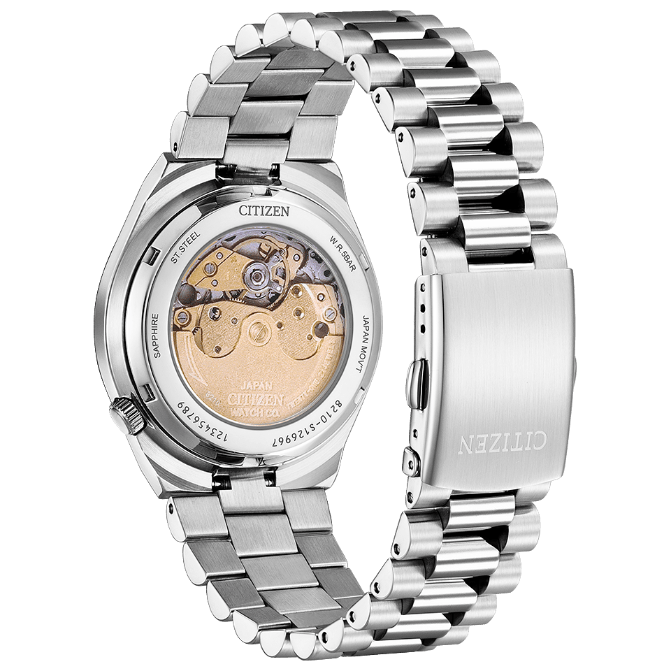 海外では“TSUYOSA”Collectionの愛称で親しまれ、人気を博しているモデル。発色の良い文字板にシンプルでベーシックな針とインデックスを組み合わせ、すっきりとしたデザインが魅力の機械式時計です。スポーティなケース形状と腕なじみの良い3列バンドで付け心地の良さにもこだわり、カレンダー部分には視認性を高める拡大鏡レンズを採用しました。シースルーバックの裏ぶたで、機械式時計ならではの回転する錘(おもり)やメカの動きを楽しめます。