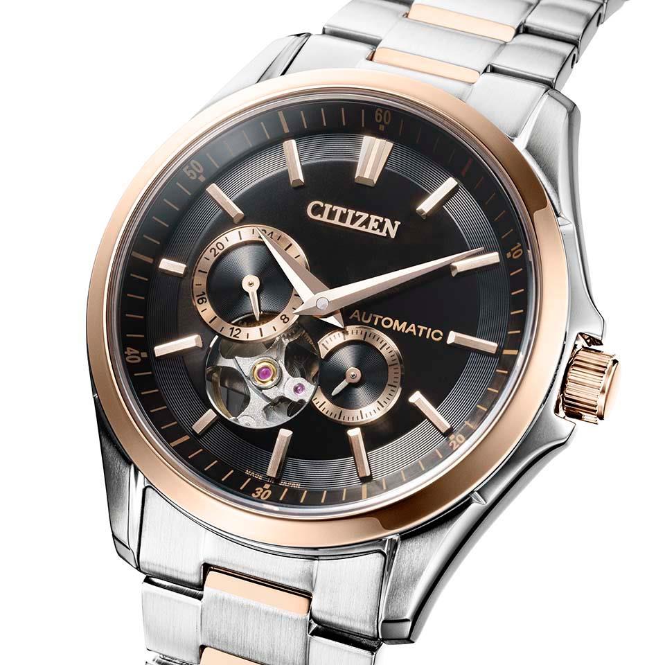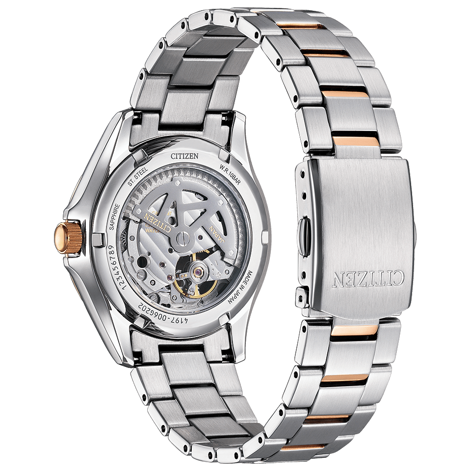 秒停止機能を搭載したキャリバーを搭載。シチズンコレクションのメカニカルウオッチがデザインをリニューアルしました。2つの別体リングを組み合わせた立体感、重厚感のあるデザイン。60秒針仕様のサブダイヤルなど、こだわりの機能を搭載しています。文字板7時の位置から、メカニカルウオッチの心臓部であるテンプの繊細な動きを堪能できるオープンハート仕様で、裏ぶたは回転する錘(おもり)部分とメカの動きを楽しめるシースルーバック。ご自身で、簡単にバンドのサイズが調整できるシンプルアジャスト仕様です。