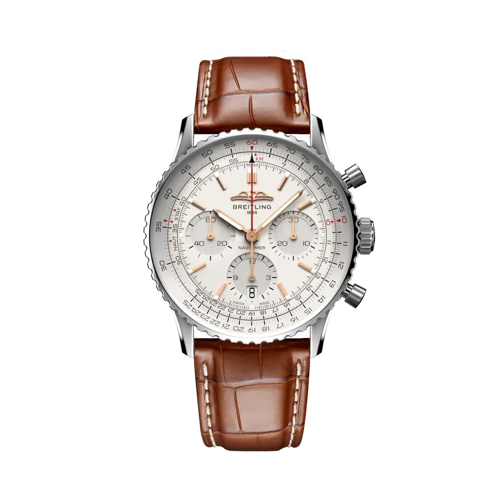 このナビタイマーはその最もクラシックな特徴を保ちながらも、現代に即した改良を加えています。平らにした回転計算尺とドーム型クリスタルで、よりスリムな外観を実現。ポリッシュとサテン仕上げを交互に施した金属部品を採用したことで、光沢を出しつつも控えめな印象に。そして、AOPAの翼が本来の12時位置に戻ったことも、ノスタルジーを喚起するアップデートと言えるでしょう。 ブライトリングのオリジナルパイロットウォッチは、70年間、飛行士にもトレンドセッターにも変わらず愛されてきました。宇宙飛行士や地上のビッグスターたちも身に着けるこのウォッチは、ブライトリングの最もアイコニックなタイムピースであり、史上最も有名なウォッチの一つです。