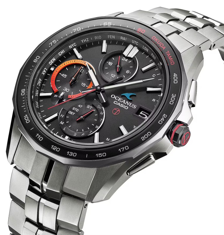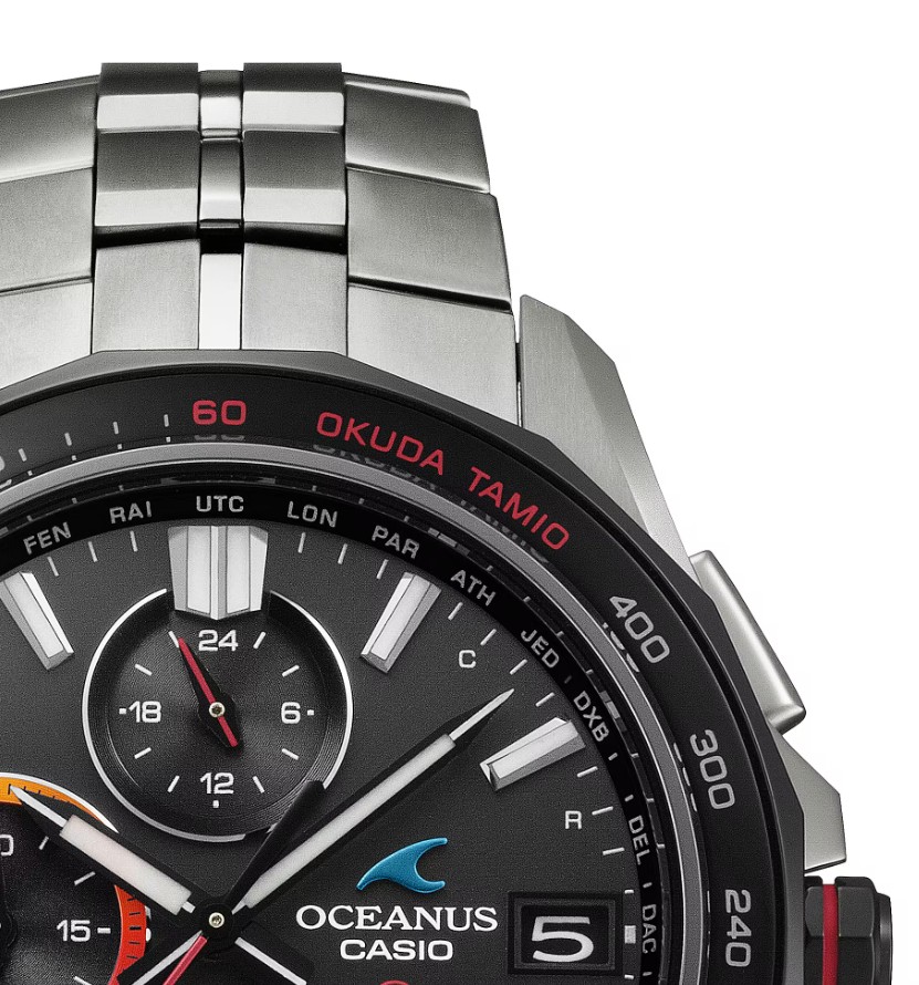 サファイアガラスベゼルのタキメーターには「OKUDA TAMIO」の文字と生誕60周年を祝い「60」の文字を赤色にした特別仕様に仕上げました。
