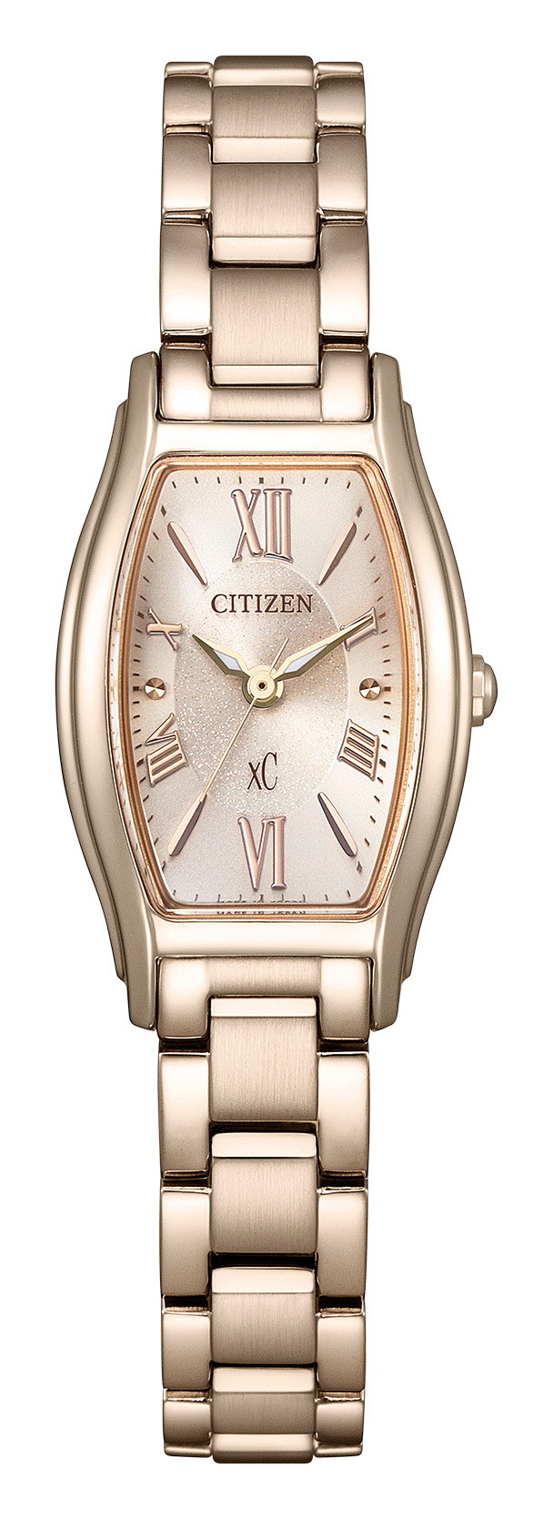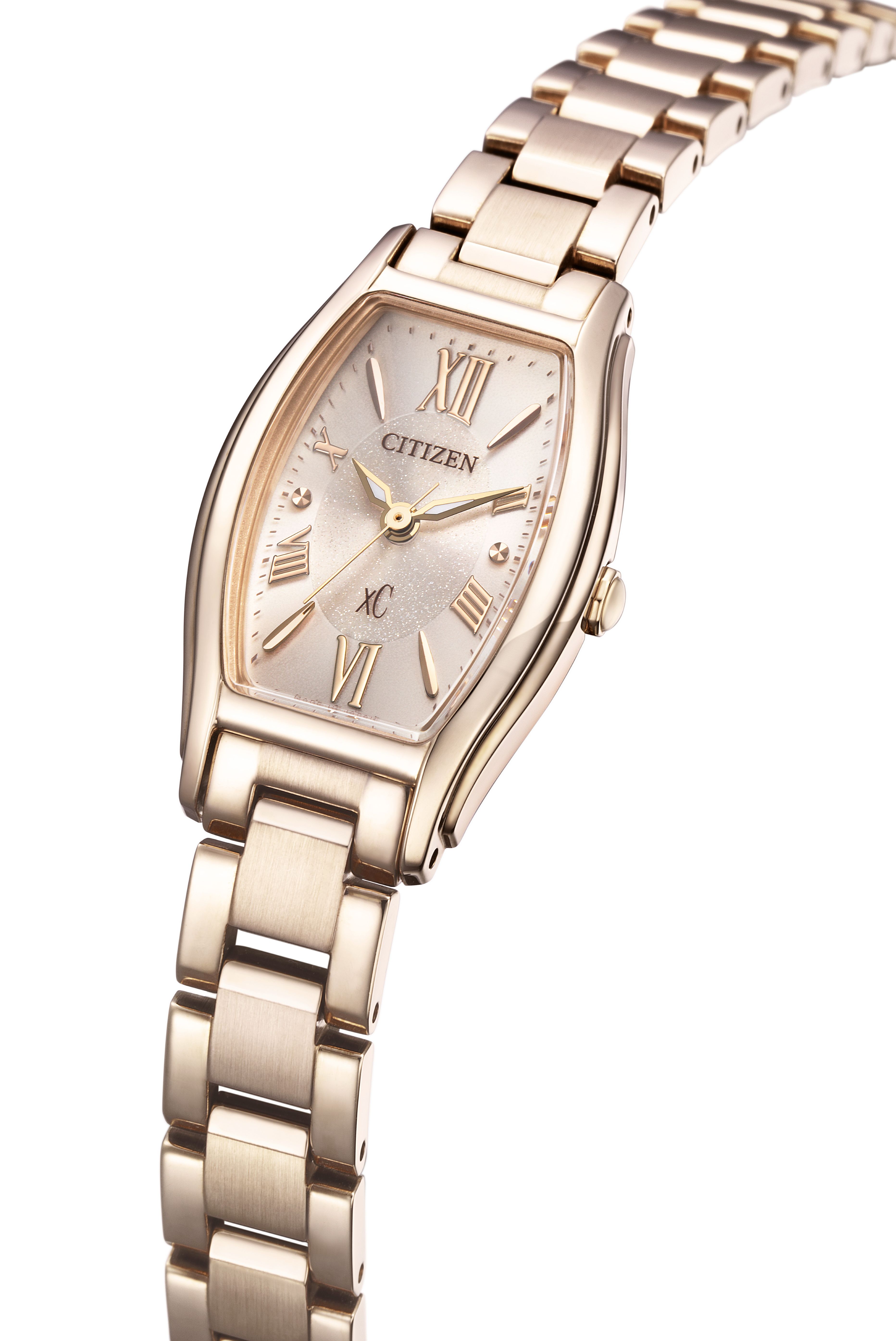 サクラカラーのケースと柔らかなベージュカラーの文字盤が優美な印象を与え、文字盤中央に施された控えめなラメがさりげなく輝きを放ちます。