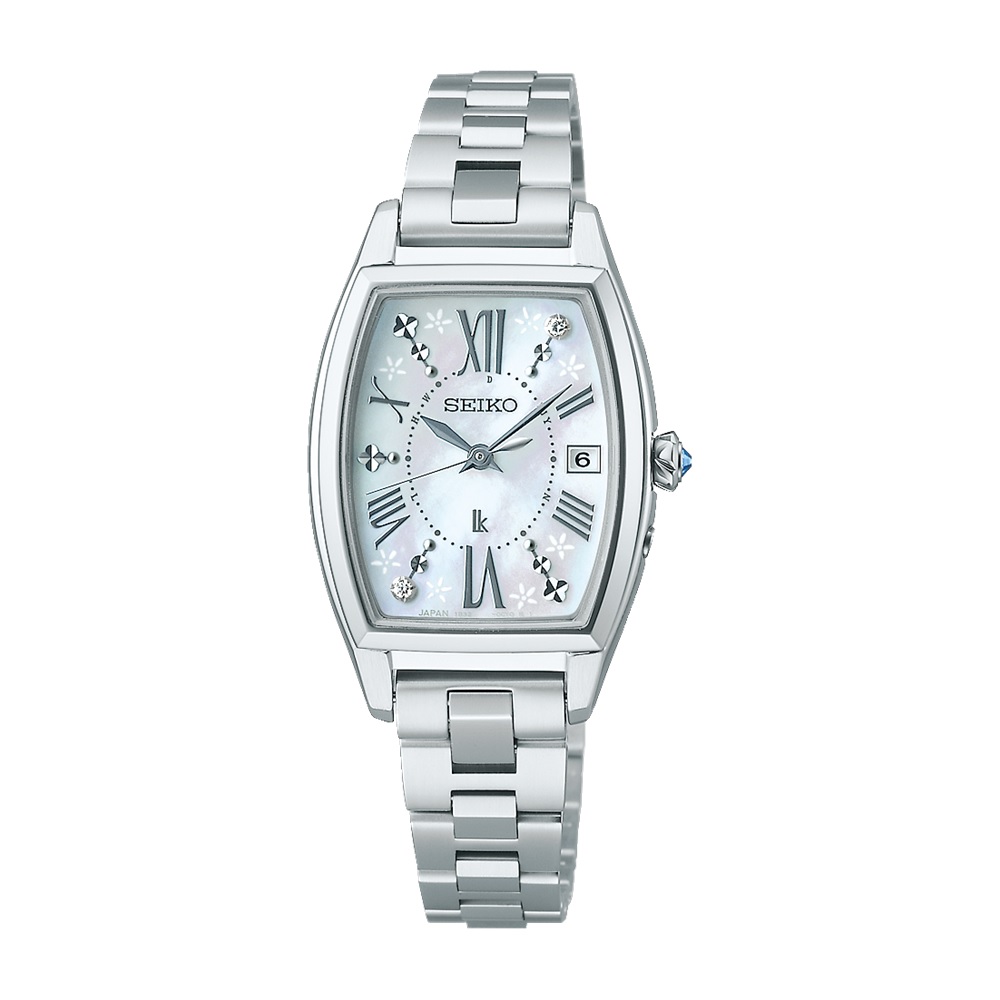 SSQW077は、「信じ合う心」という花言葉を持つブルースターをテーマに、真っ白な白蝶貝のダイヤルにブルースターの柄をさりげなく散りばめたデザイン。
