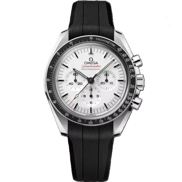 この42mmのステンレススティール製ムーンウォッチは、フロントとケースバックにサファイアクリスタルガラスが採用されています。月面で着用された第4世代のスピードマスターのデザインからインスピレーションを得たこのモデルは非対称ケースを備え、ホワイトラッカー仕上げの段差を設けたステップダイアルには、アプライドのオメガロゴとインデックス、ムーンウォッチスタイルの針が配されています。そして、陽極酸化処理を施したアルミニウム製ベゼルリングに有名な「ドットオーバー90」(90の数字の上にドット)があしらわれています。