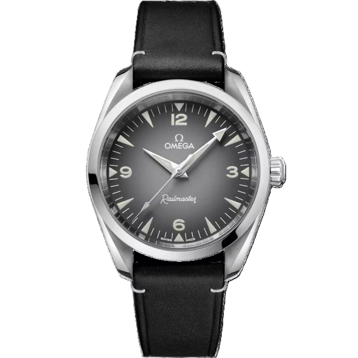 ブラッシュ&ポリッシュ仕上げを施した左右対称の38mmのケースには、ブラックのレザーストラップが合わせられています。初代「レイルマスター」の読み取りやすい表示を活かしたこのモデルのダイアルは、ブラックのグラデーションがかかったグレーカラー。大きな数字とインデックスにはホワイトのスーパールミノヴァが塗布されています。