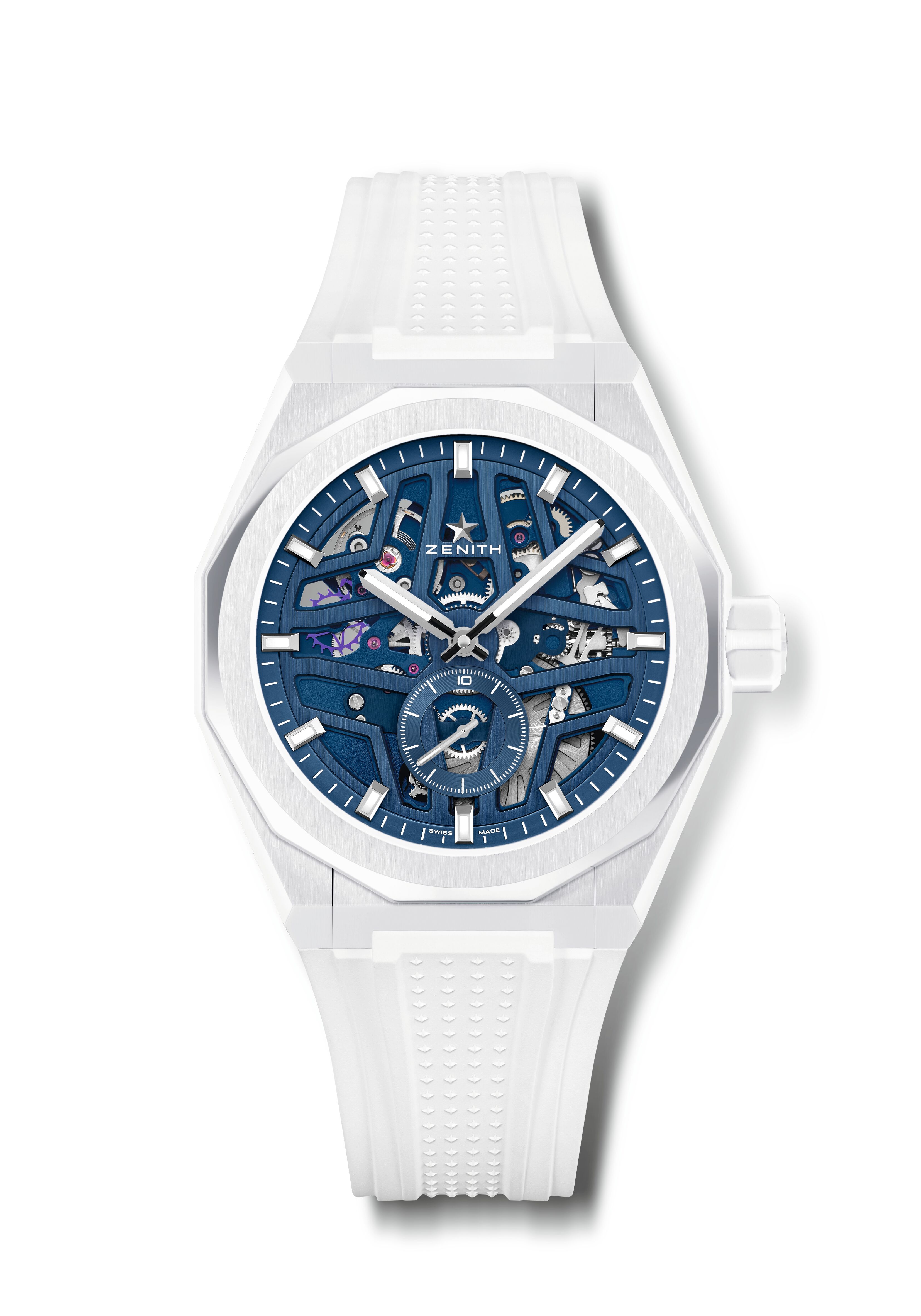 八角形の41mmホワイトセラミックケースに、ファセットカットのベゼルを配した「デファイ スカイライン スケルトン」。ブルーのオープン文字盤に、ゼニスの象徴である4つの点を結んだ星があしらわれています。世界初の1/10秒精度を誇るインジケーターを備えた自社製高振動自動巻スケルトンムーブメント エル・プリメロ 3620 SKを搭載。セラミックブレスレットとホワイトラバーストラップが付属し、ストラップ交換システムを存分にお楽しみいただけます。