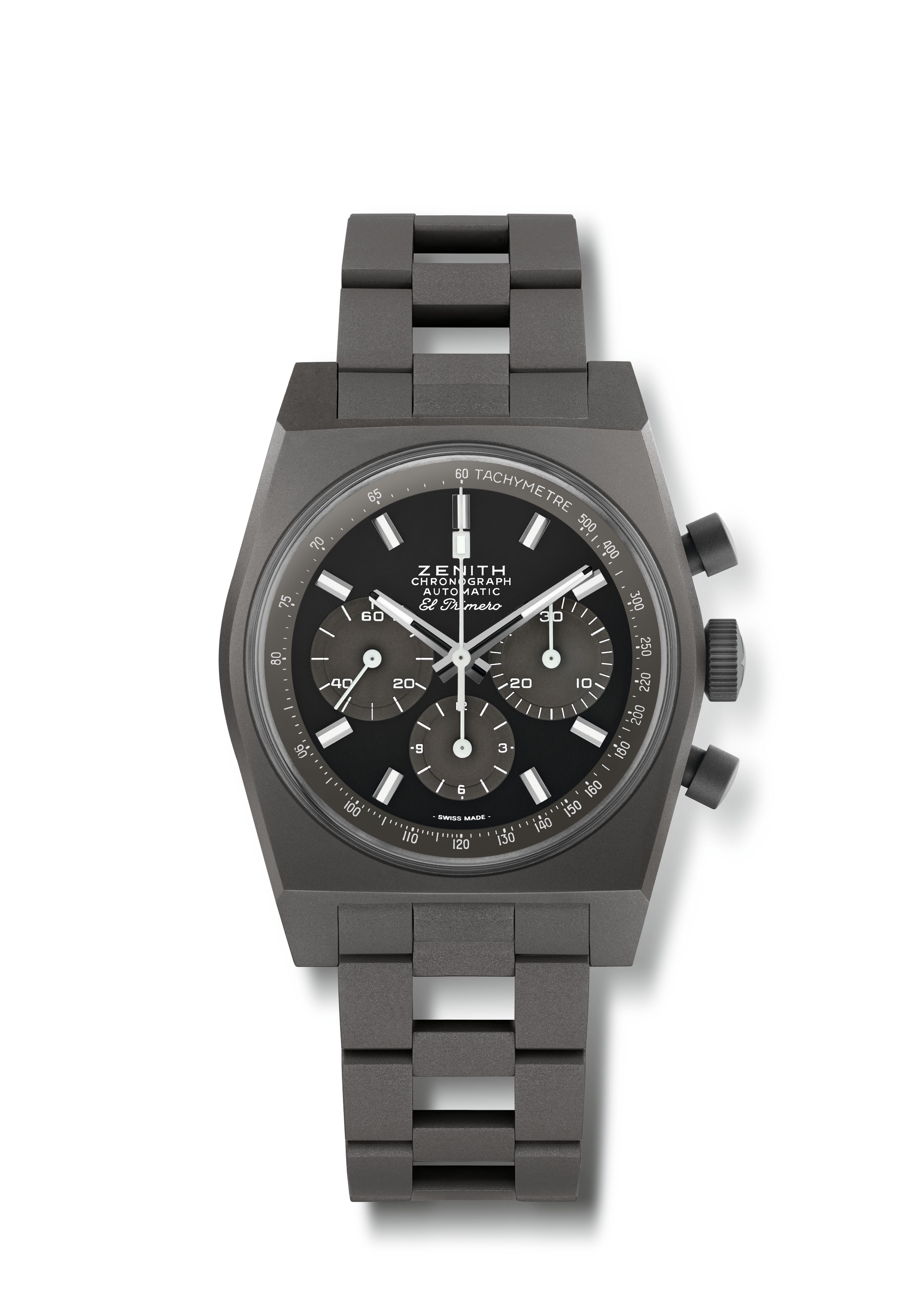 クロノマスター リバイバル シャドウは、ブラックケースを備えた幻の1970年代のゼニス クロノグラフのプロトタイプの外観を模倣しています。このモデルでは、さりげない外観が全体にマット仕上げが施されたチタンケースで再現されています。ブラックの文字盤には、セコンドトラックも日付窓もありません。フォールディングバックル付きのマイクロブラスト仕上げのチタンブレスレットが付属します。
