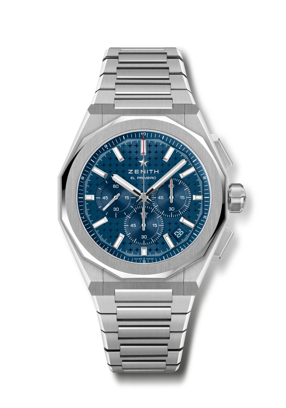 八角形の42mmスチールケースとファセットカットのベゼルが特徴のデファイ スカイライン クロノグラフ。サンバーストパターンのブルー文字盤に、ゼニスの象徴である4つの点を結んだ星があしらわれています。1/10秒精度を誇る初のインジケーターを備えた高振動エル・プリメロ 3600自動巻クロノグラフムーブメントを搭載。交換可能なスチールブレスレットとブルーラバーストラップが付属します。