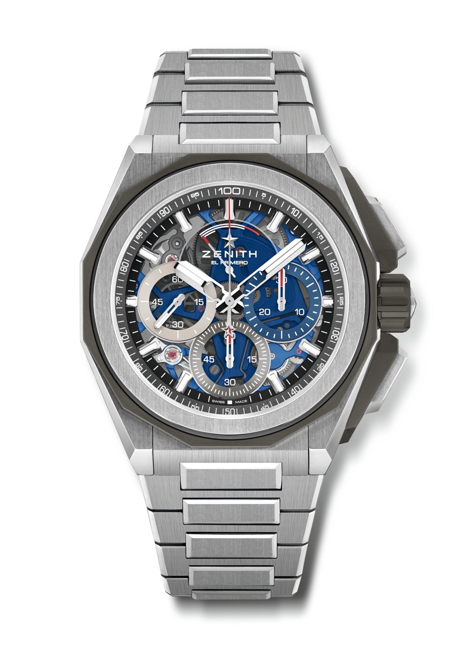 1/100秒計測のクロノグラフであるデファイ エクストリームは、ポリッシュ仕上げとサテンブラッシュド仕上げを組み合わせた、軽量でありながら頑強なチタン製です。アプライドカウンターが付いたサファイア文字盤からは、50Hzと5Hzで鼓動する2つの脱進機を備えたブルーのエル・プリメロ 21自動巻ムーブメントを眺めることができます。デファイ エクストリーム ウォッチには、チタン製ストラップおよびラバーストラップ、ベルクロストラップが取り付けられています。