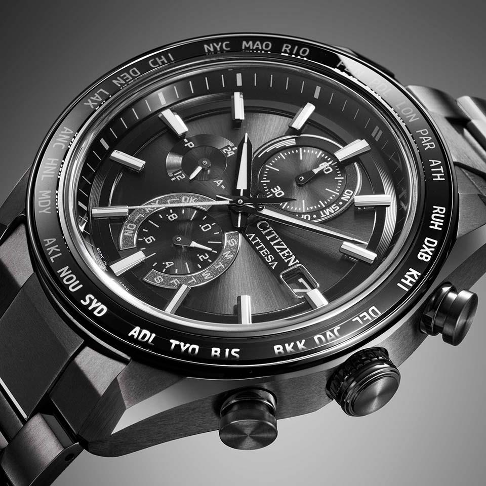 モノトーンでまとめたカラーリングで視認性を確保しました。ベゼルはGPS搭載モデルで人気のサファイアガラスリングを搭載した高級仕様で、サファイアベゼルの上にシルバー蒸着で仕上げた都市名表示が輝きます。ベゼルにリング状のサファイアを埋め込み、美しい艶と輝きを宿したワンランク上の1本。