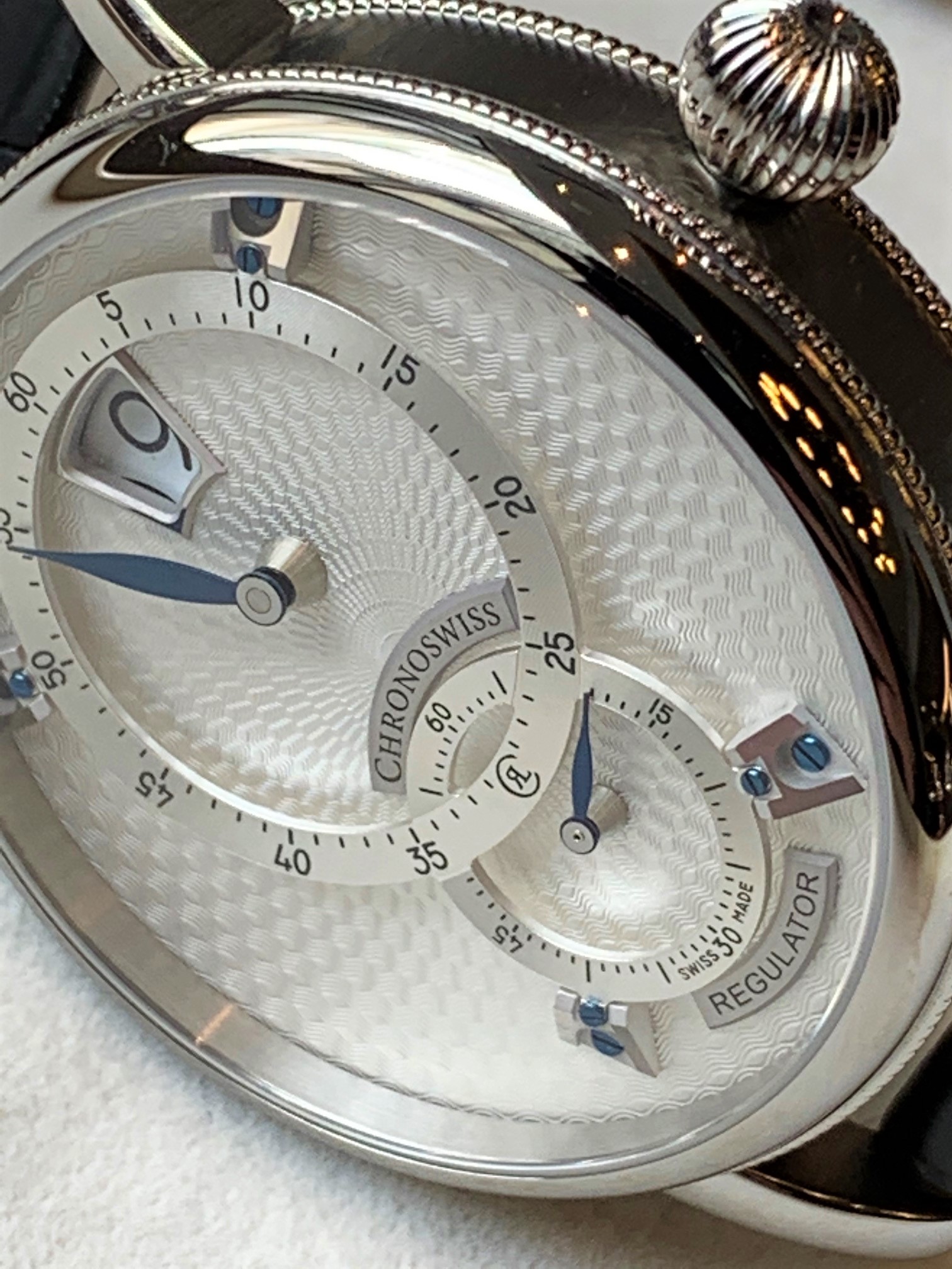 ギョーシェ彫りを手作業で施すブランドは今日ではごくわずかですが、クロノスイスでは1900年代前半に作られたギョーシェマシンを職人が操り、1枚1枚時間をかけて丁寧に施しています。