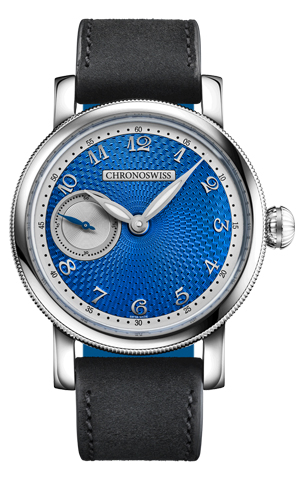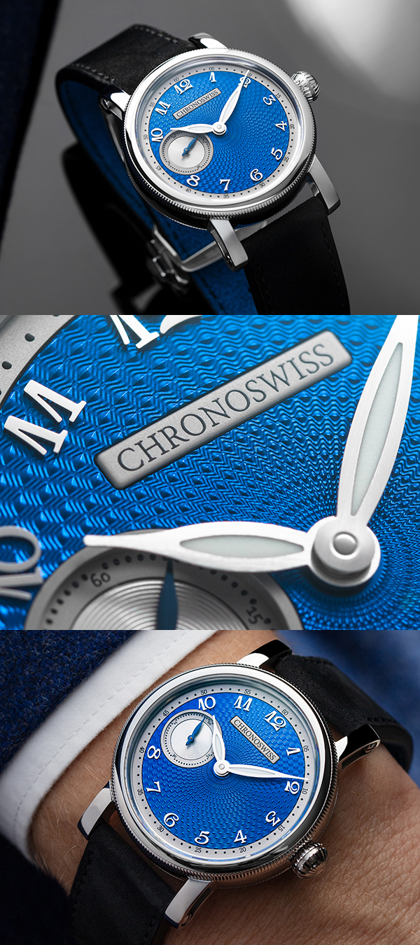 クロノスイスは近年、文字盤の装飾にこだわっており、この「ブルーオービット」は緩やかに湾曲した文字盤に職人が手作業でギョーシェ彫りを施し、鮮やかなブルーのCVDコーティングで色合いの変化をもたらしています。