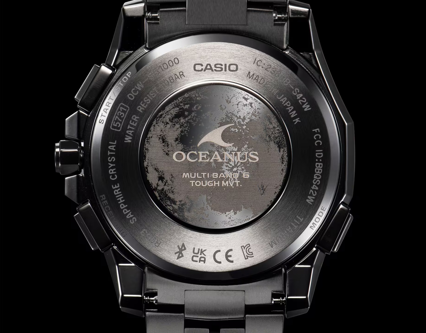 ダイアルには月面の凹凸や陰影をモチーフにしたテクスチャーを採用し。OCW-SG1000CNは金属文字盤を採用することで高級感を高めております。人工衛星などに搭載されている太陽電池技術を腕時計向けに応用し開発された発電システム『ガリウムタフソーラー』を採用することで、従来のソーラーと比べて発電効率が飛躍的に向上たことにより、パーツに異なる着色を施しながらも従来の半透過素材のダイアルにはない装飾・加工・仕上げを実現しました。