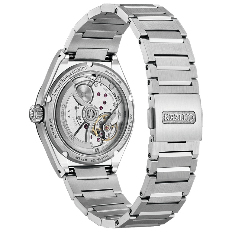 また、ケースやバンドも印象的な仕上がりとなっており、ラグのない大胆な面構成、ヘアライン仕上げのステンレスケースとバンドの随所にあしらったミラー仕上げの輝き、そしてシースルーバックの裏ぶたには、リミテッドエディションナンバーが刻印されております。