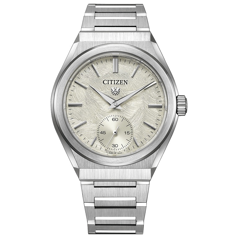 高度な金属転写技術である「電気鋳造」手法を用いた独創的な文字板に挑んできた『メカニカルモデルCaliber 0200』。本モデルはアイボリーカラーの文字板に、The CITIZENのシンボルである「イーグル」の羽を模したパターンを電鋳で施し、落ち着いた色味の中に躍動感のある仕上げを実現。さらに、直線的なインデックスや針と、曲線基調で有機的な模様を巧みに組み合わせることで、審美性と機能性が調和した印象的な文字板に仕上げています。