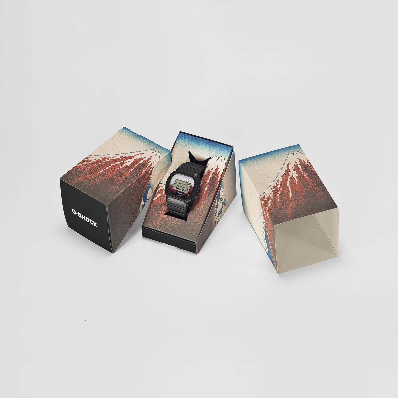 定番デジタルDW-5600に北斎の代表作である富嶽三十六景の中から「深川万年橋下」と「山下白雨」を大胆にデザイン。