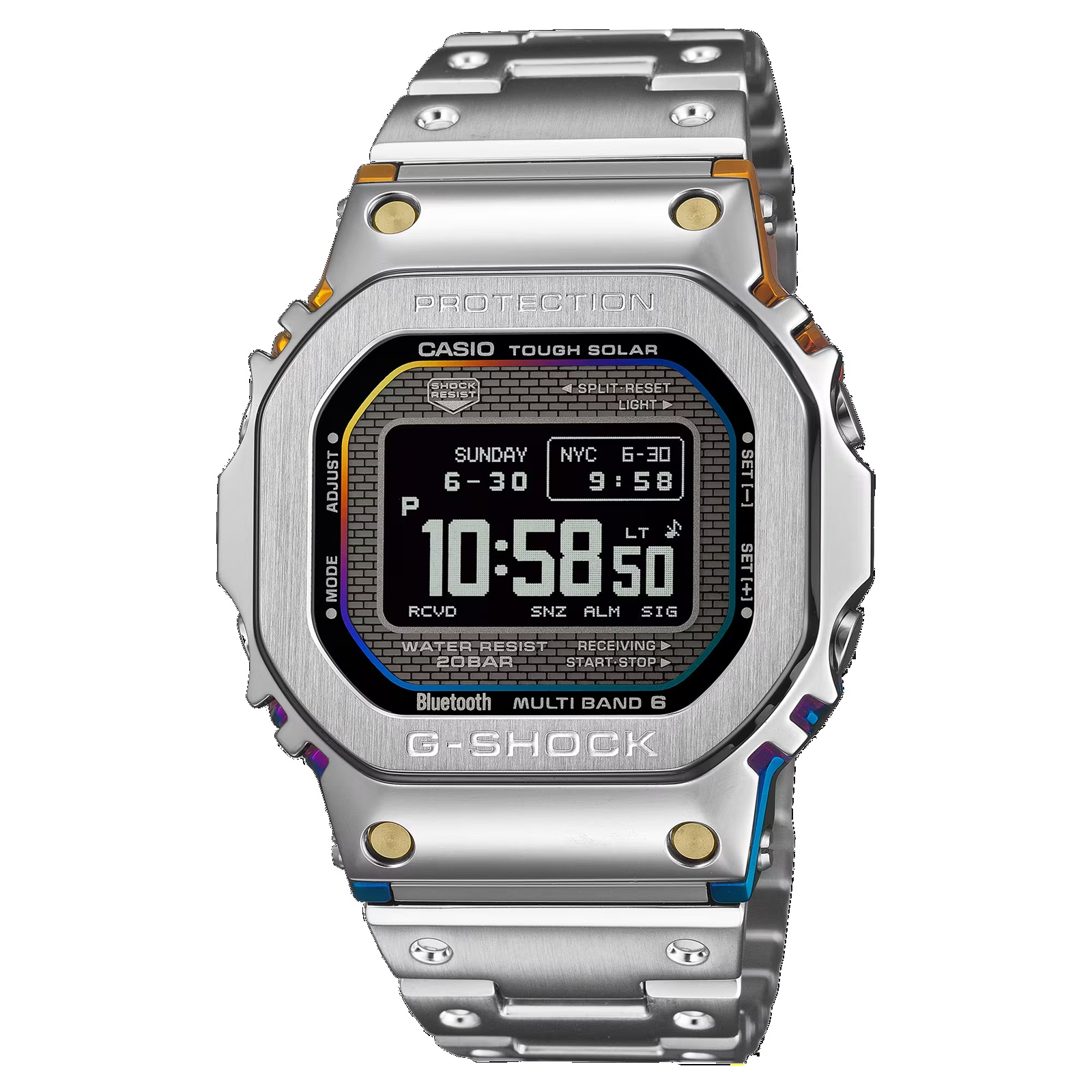 GMW-BZ5000RCでは、このセンターケースに鮮やかなレインボーカラーを配色。ダブルコーティングによるIP処理を施すことで、奥行きあるグラデーション表現を実現しました。ブランドの進化を象徴する先進性と創造性を、永続する輝きとして具現化したものです。また、フロントビスには金属の質感を際立たせるゴールドIPを採用しています。フェイスは外周フレームにグラデーションカラーをガラス蒸着。G-SHOCK初号機から受け継がれるアイコニックなデザインに、鮮やかな色彩が新たな生命を吹き込みます。