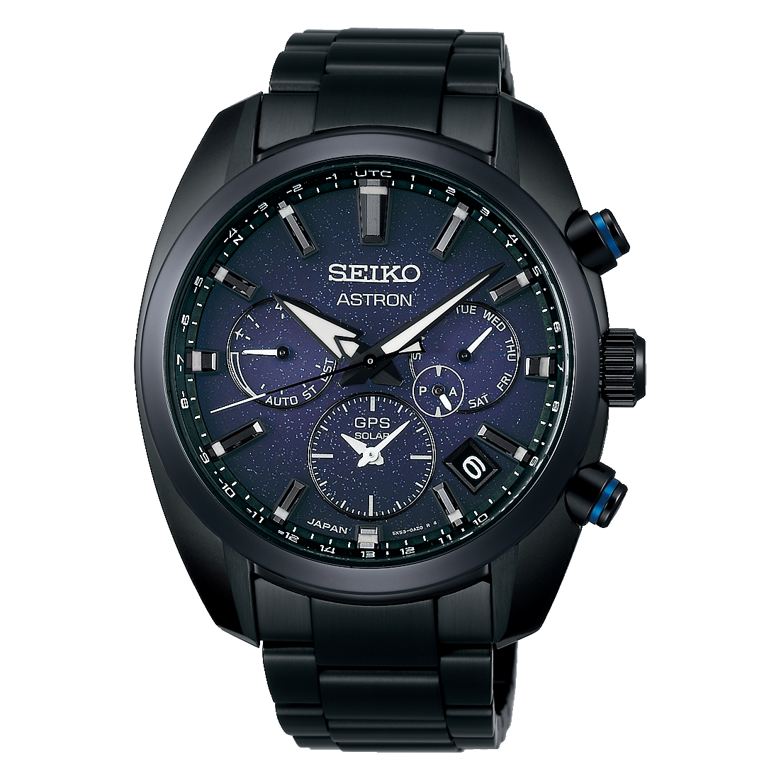 ケースとブレスレットのオールブラックに馴染むダークブルーのダイヤルには、宇宙に散りばめられた星を想起させるラメが施されており、小宇宙のような美しい空間が広がっています。