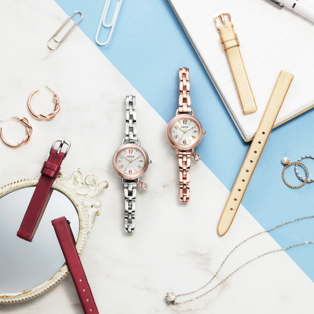 揺れるたびに輝くチャームが人気のブレスラインから、その日の気分やスタイルに合わせて選べる替えバンド付きの2wayモデルが登場。オンオフを選ばずおしゃれ感のあるサテン素材のバンドは、ベージュとマルベリーカラーの2種類をラインナップしています。