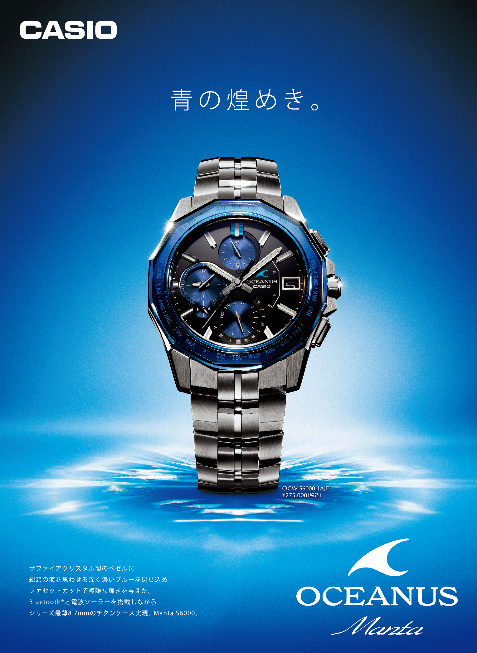 ベゼルは、厚みのあるサファイアガラスベゼルに24面のファセットカットを採用。あらゆる角度から透明感ある美しいブルーが楽しめるよう、ブルーブラックグラデーション蒸着を基調に、蒸着、スパッタリング処理を複数回、複雑にかけて着色しています。また、視認性を高めるため漆黒の鏡面文字板を採用。時分針は断面が台形形状の3面カット針で、天面にヘアライン、両サイド斜面にミラー仕上げを施し、ケースとバンドにもシルバーの輝きが特徴的なチタンカーバイトを施しています。機能面では電波受信機能による時計単体での時刻修正に加え、Bluetooth®を利用したスマートフォンリンクによる時刻修正機能を搭載。ワールドタイムの時刻を約300都市から設定したり、自動でタイムゾーンやサマータイムの変更に対応できます。機能性とデザイン性を兼ね備えた上質なOCEANUS マンタです。