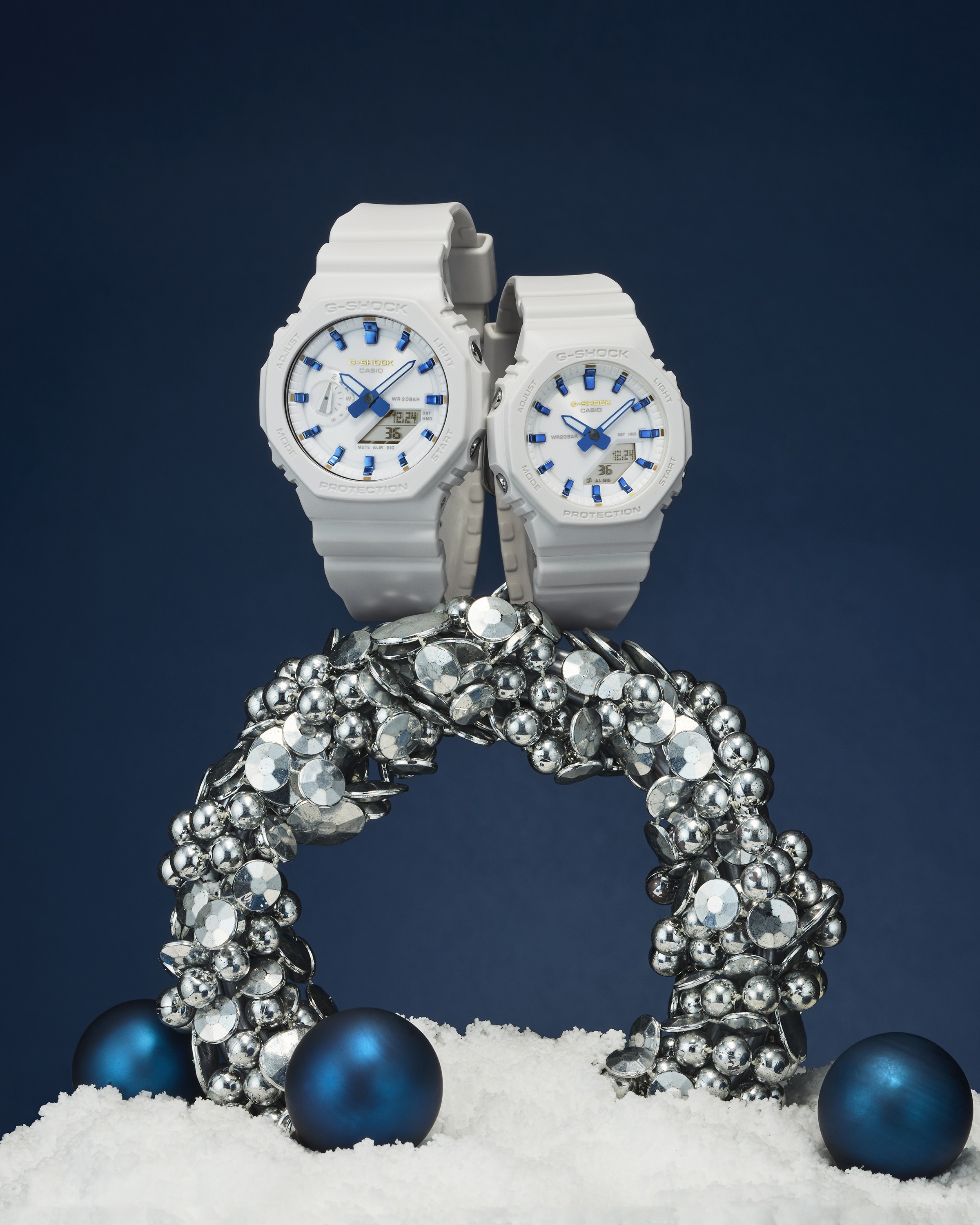 ダイアルに透明蒸着を施し質感を高め、インデックスにはブルー蒸着を施し、シルバー・ゴールドの差し色がクリスマスの華やかさを演出。マットホワイトのベゼルとバンドに、G-SHOCKロゴおよびアワーマーカーのゴールドが特別感を添えます。裏蓋にはラバーズコレクションのシンボル「天使&悪魔」を刻印。大切な人との絆を見守ります。