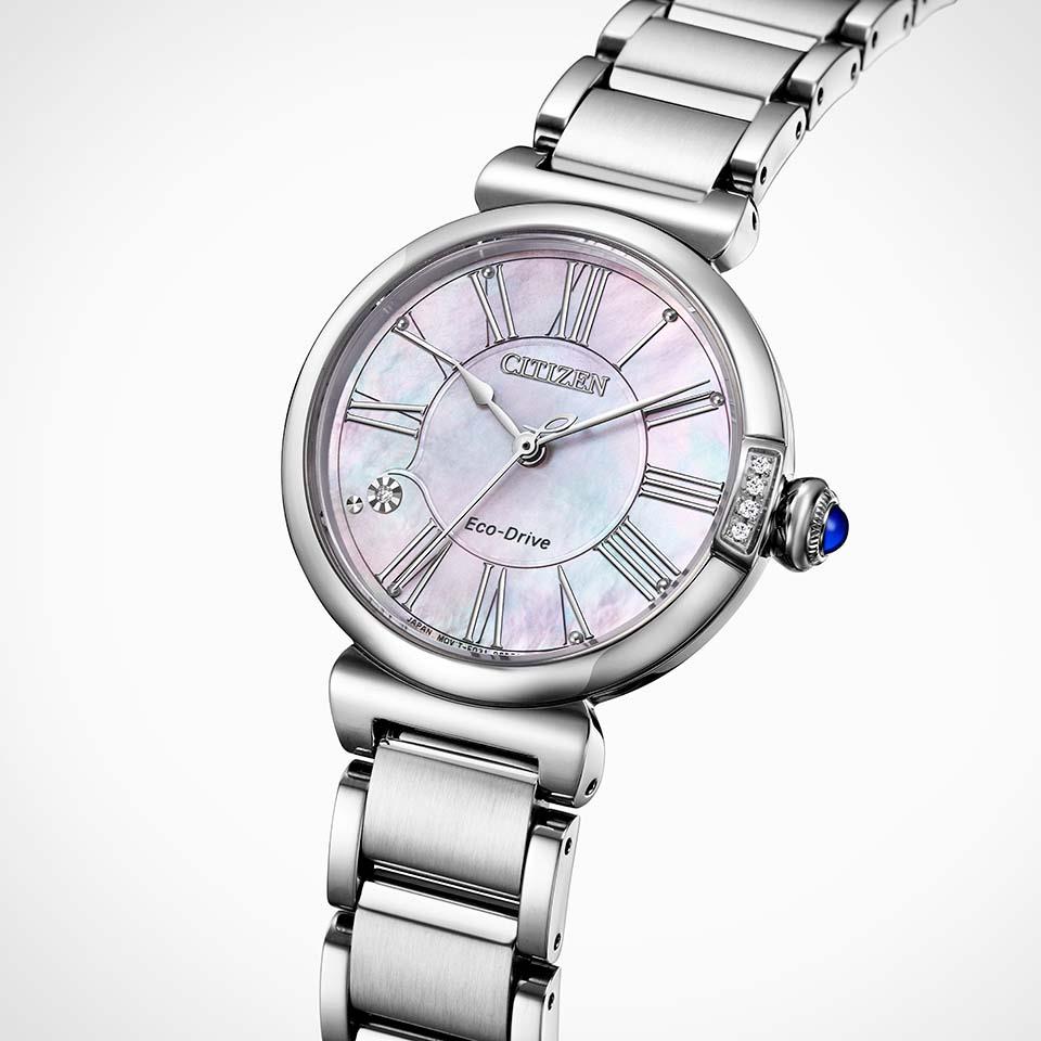 透明感のあるみずみずしいカラーの文字板で、白蝶貝にやわらかなピンクのグラデーションをあしらい、上品な華やかさを演出。8時の位置に配した1ポイントのダイヤモンドは、雨上がりにスズランの花からこぼれ落ちる雫を表現しています。