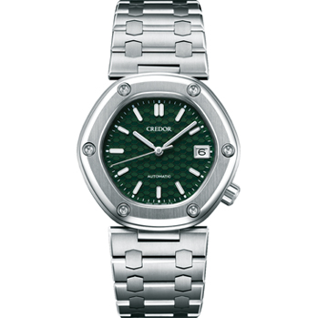 鉄道の進行信号を象徴する緑の文字盤は、ブランドの推進力を表現。